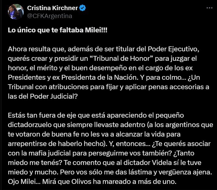 Cristina Kirchner no tardó en responder. En el escrito que publicó en sus redes sociales se dirigió directamente al Presidente al que, después de llamarlo pequeño dictadorzuelo, le preguntó: «¿Te querés asociar con la mafia judicial para perseguirme vos también? ¿Tanto miedo me tenés? Te comento que al dictador Videla sí le tuve miedo y mucho. Pero vos sólo me das lástima y vergüenza ajena». Y siguió cuestionando al «tribunal de honor» del mandatario: «Contame… ¿Quiénes integran ese ‘Tribunal de Honor’? ¿Vos, tu hermana y Adorni? La verdad es que si hacen un concurso para ver quién es más burro, salen empatados».