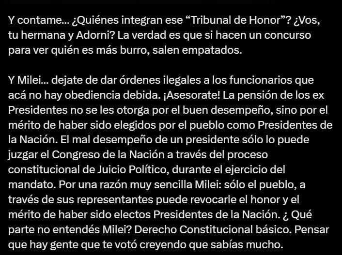 Además, la exmandataria le pidió a Milei que deje «de dar órdenes ilegales a los funcionarios», lo mandó a asesorarse y le recordó que la pensión de los expresidentes no se otorga por el buen desempeño, sino «por el mérito de haber sido elegidos por el pueblo como Presidentes de la Nación». «El mal desempeño de un presidente sólo lo puede juzgar el Congreso de la Nación a través del proceso constitucional de Juicio Político, durante el ejercicio del mandato», subrayó.