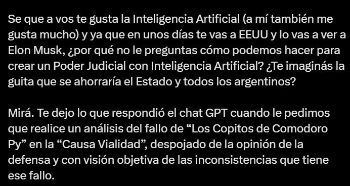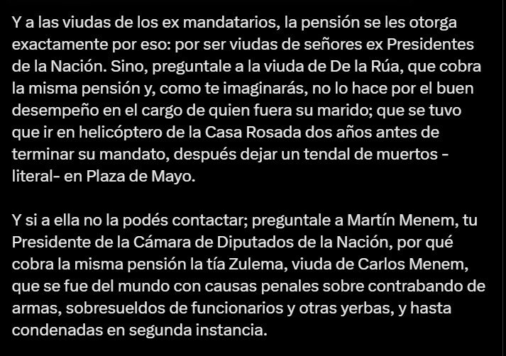 En esa línea, CFK mandó a Milei a preguntarle a la viuda del expresidente Fernando De la Rúa, Inés Pertiné, quien cobra la misma pensión más allá de que su marido «se tuvo que ir en helicóptero de la Casa Rosada dos años antes de terminar su mandato, después dejar un tendal de muertos –literal– en Plaza de Mayo», o a Zulema Menem, que cobra la pensión de su marido Carlos Menem que, «se fue del mundo con causas penales sobre contrabando de armas, sobresueldos de funcionarios y otras yerbas», puntualizó. Zulemita Menem salió a responderle con un tweet en el que confirmó que su madre cobra la pensión y enumeró una serie de causas judiciales que tuvo su padre que, al igual que CFK, en ninguna tiene sentencia firme.