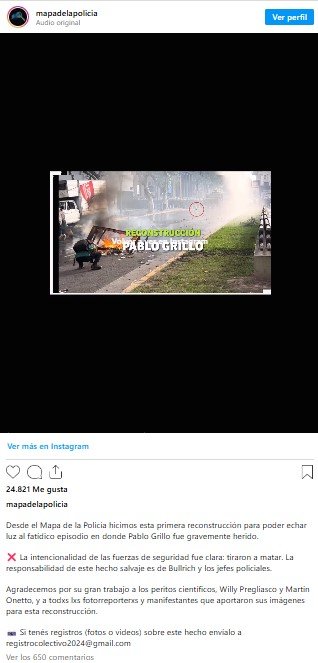 “La intencionalidad de las fuerzas de seguridad fue clara: tiraron a matar. La responsabilidad de este hecho salvaje es de Bullrich y los jefes policiales”, señalaron en sus redes sociales en las que publicaron un video en el que se traza el recorrido del proyectil que impacta en Grillo.