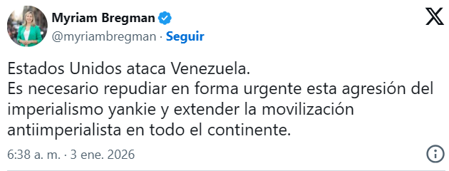 En Argentina, la diputada del FIT, Myriam Bregman, repudió el bombardeo y denunció la violencia ejercida contra un país soberano.