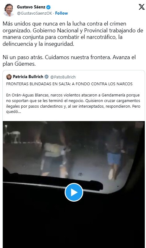 El gobernador Gustavo Sáenz, por su parte, retuiteó a la funcionaria nacional no sin antes indicar en la misma red social: “Más unidos que nunca en la lucha contra el crimen organizado. Gobierno Nacional y Provincial trabajando de manera conjunta para combatir el narcotráfico, la delincuencia y la inseguridad. Ni un paso atrás. Cuidamos nuestra frontera. Avanza el plan Güemes”.
