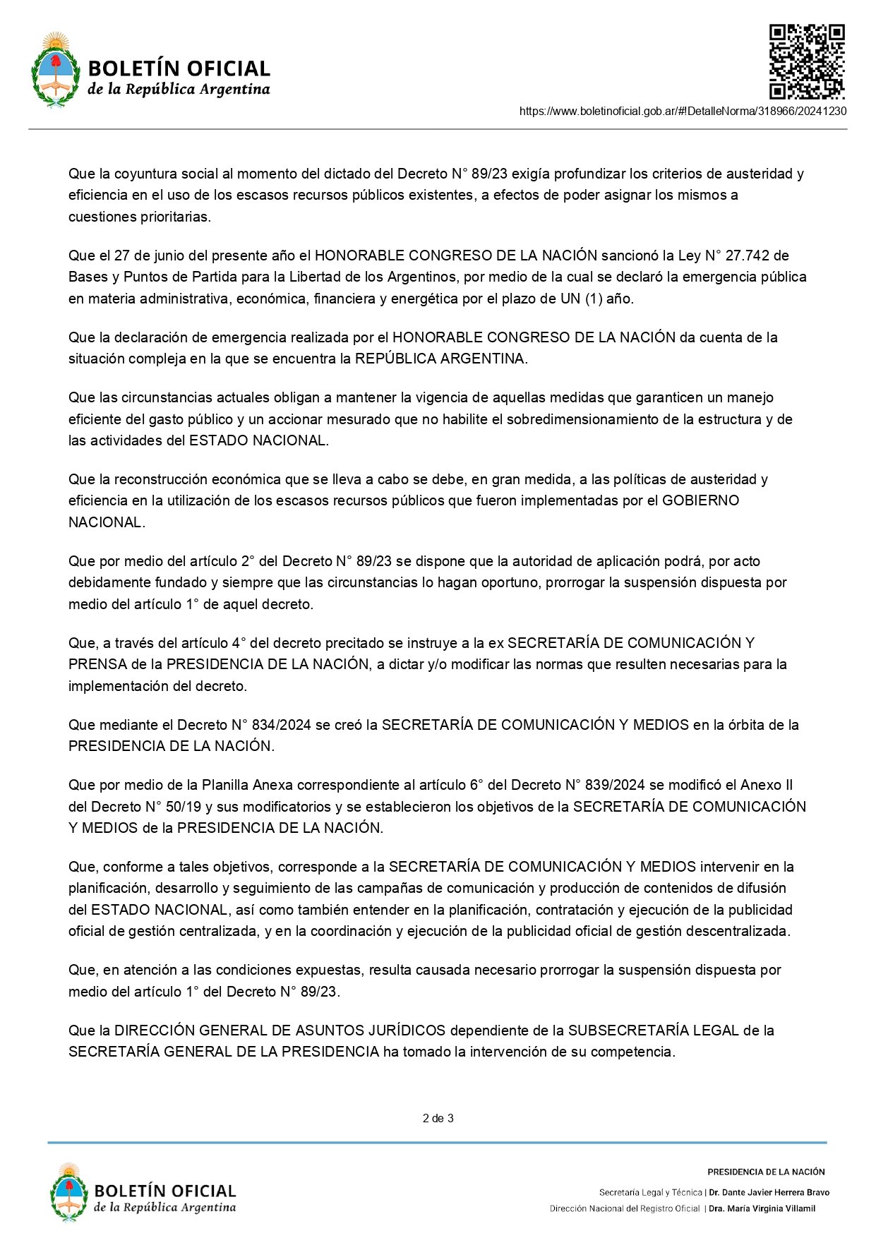 En los considerados de la resolución 7147/2024, se recordó que el decreto 89/23 suspendía la pauta oficial “con el doble objetivo de adecuar las estructuras y procedimientos de la administración nacional y volver más eficiente criterio de gasto público, dadas las circunstancias del país al momento del dictado del decreto”.