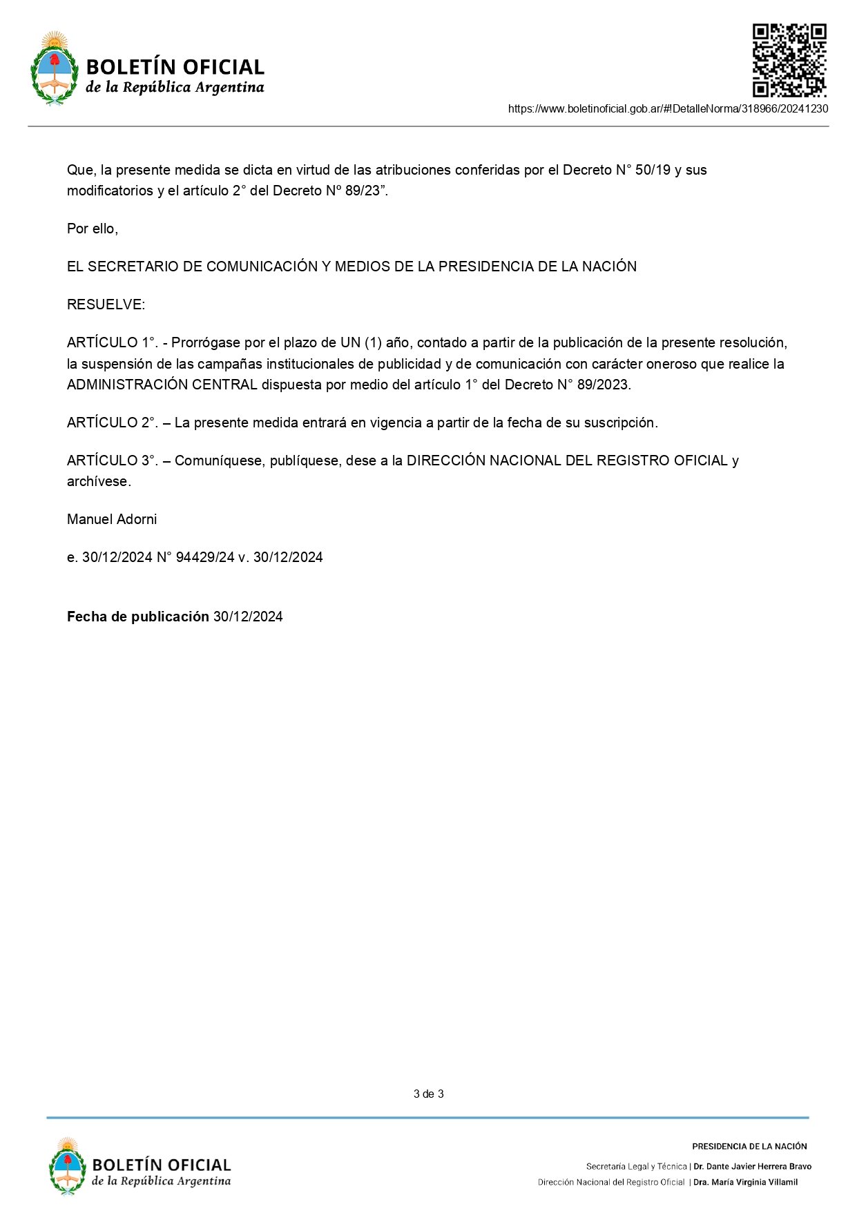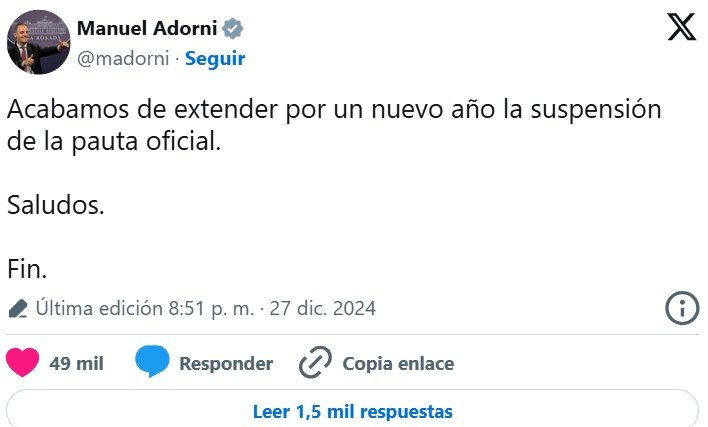 Con la firma del portavoz Manuel Adorni, el Gobierno prolonga la prohibición de la pauta oficial, una medida que va en línea con las políticas de austeridad fiscal que se trazó la administración de Javier Milei.