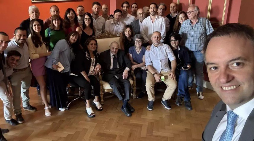 30/12/2024.- www.eldiarioar.com.- Foto portada: El portavoz presidencia, Manuel Adorni, junto a los periodistas acreditados en Casa Rosada, en el brindis de fin de año, el pasado 23 de diciembre de 2023.