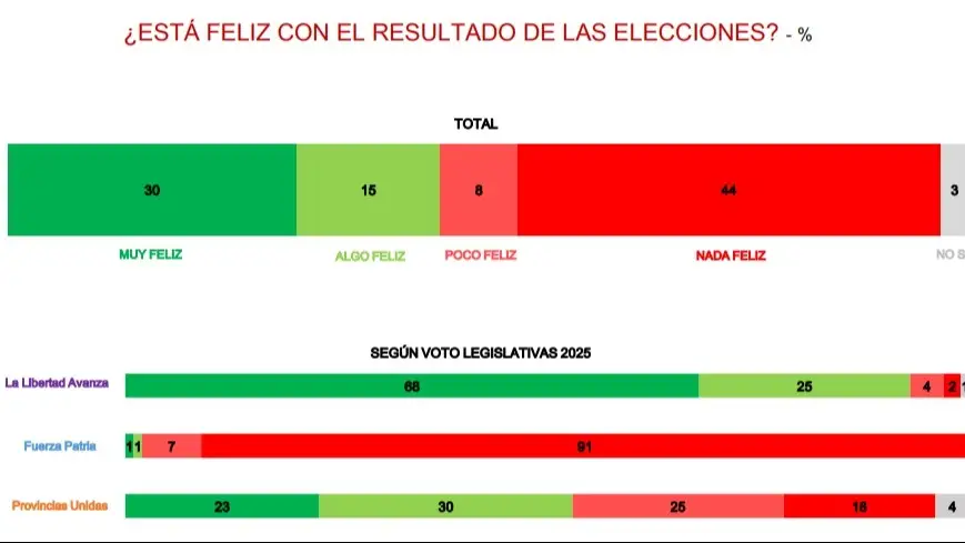 La primera encuesta tras las elecciones, revelada por una consultora privada, reveló que el 52% de los encuestados afirmó sentirse descontento con los resultados de las elecciones legislativas del 27 de octubre pasado. De ese porcentaje, un 44% consideró estar «nada feliz», mientras que un 30% aseguró estar «muy feliz» con los comicios que dieron ganador a La Libertad Avanza (LLA). El sondeo también dio a conocer que 6 de cada 10 argentinos consideran que la situación económica actual es peor que la del año pasado.