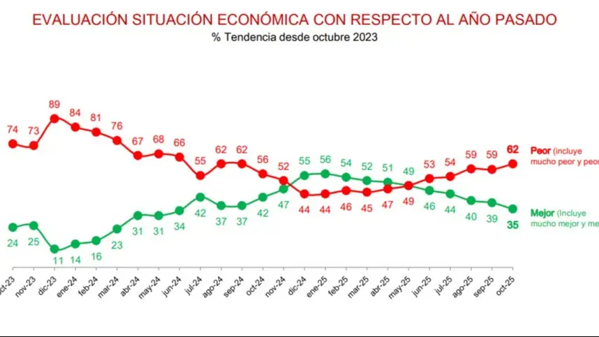 En este contexto, las expectativas hacia 2026 también empeoran: el 52% de los encuestados cree que la economía estará peor dentro de un año, cuatro puntos más que en septiembre.