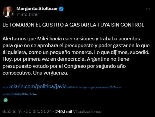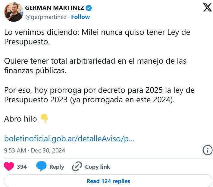 «Lo venimos diciendo: Milei nunca quiso tener Ley de Presupuesto. Quiere tener total arbitrariedad en el manejo de las finanzas públicas. Por eso, hoy prorroga por decreto para 2025 la ley de Presupuesto 2023 (ya prorrogada en este 2024)», advirtió Martínez en su cuenta de X.