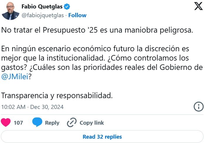 Quetglas, por su parte, sostuvo que «no tratar el Presupuesto 2025 es una maniobra peligrosa». Y evaluó en ese sentido: «En ningún escenario económico futuro la discreción es mejor que la institucionalidad. ¿Cómo controlamos los gastos? ¿Cuáles son las prioridades reales del Gobierno de @JMilei?«.