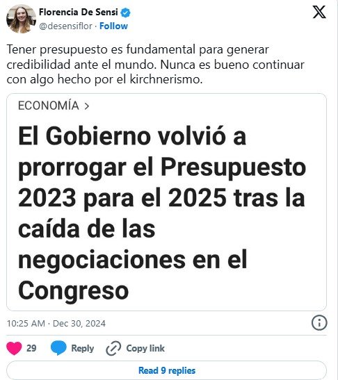 También hubo críticas de parte del PRO, aunque más sutiles que las expresadas por el resto de los bloques. La diputada Florencia De Sensi -quien responde a Cristian Ritondo- indicó en la red social X que «tener presupuesto es fundamental para generar credibilidad ante el mundo» y, de paso, que «nunca es bueno continuar con algo hecho por el kirchnerismo».