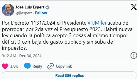 «Por Decreto 1131/2024 el Presidente Milei acaba de prorrogar por 2da vez el Presupuesto 2023. Habrá nueva ley cuando la política acepte 3 cosas al mismo tiempo: déficit 0 con baja de gasto público y sin suba de impuestos«, publicó en X.