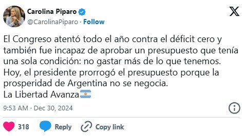 Carolina Píparo, diputada de La Libertad Avanza, también salió a responsabilizar a la oposición de la falta de presupuesto 2025. «El Congreso atentó todo el año contra el déficit cero y también fue incapaz de aprobar un presupuesto que tenía una sola condición: no gastar más de lo que tenemos. Hoy, el presidente prorrogó el presupuesto porque la prosperidad de Argentina no se negocia. La Libertad Avanza», publicó en X.