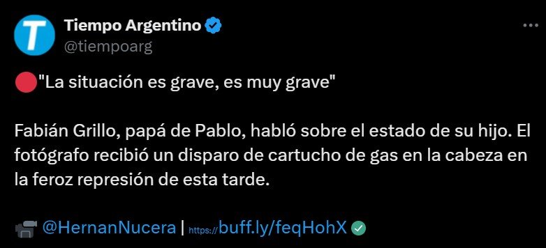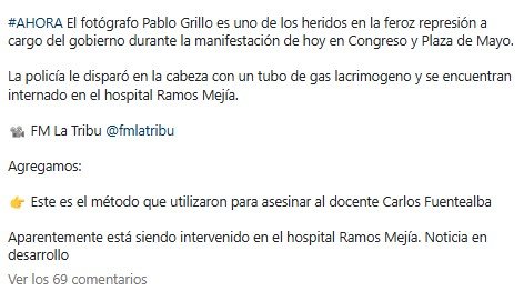 Un video de FM La Tribu capturó imágenes del momento exacto del impacto. Ocurrió a pocos metros del Congreso, sobre Hipólito Yrigoyen y enseguida distintos manifestantes se acercaron para ayudarlo. Grillo es un fotógrafo independiente. “Saco fotos tmb… documentos visuales”, se autodescribe en su cuenta de Instagram. Trabaja como jardinero en el Hospital Evita de Lanús, en la Provincia de Buenos Aires y acumula años de militancia, el último tiempo ligado a Nuevo Encuentro.
