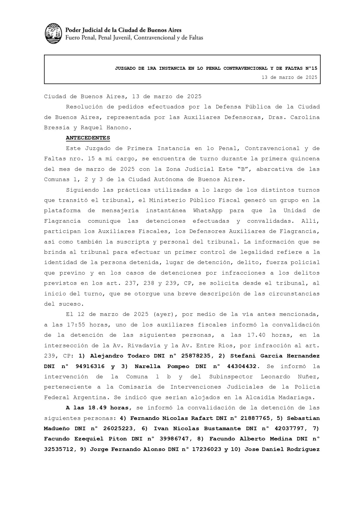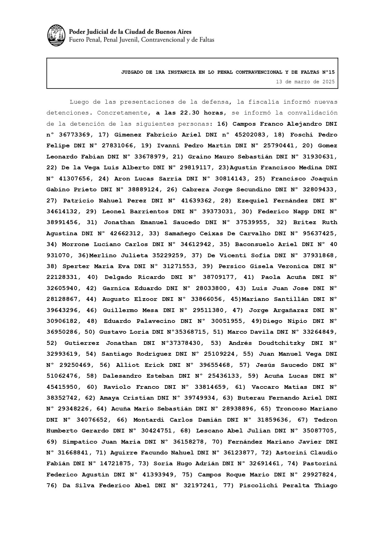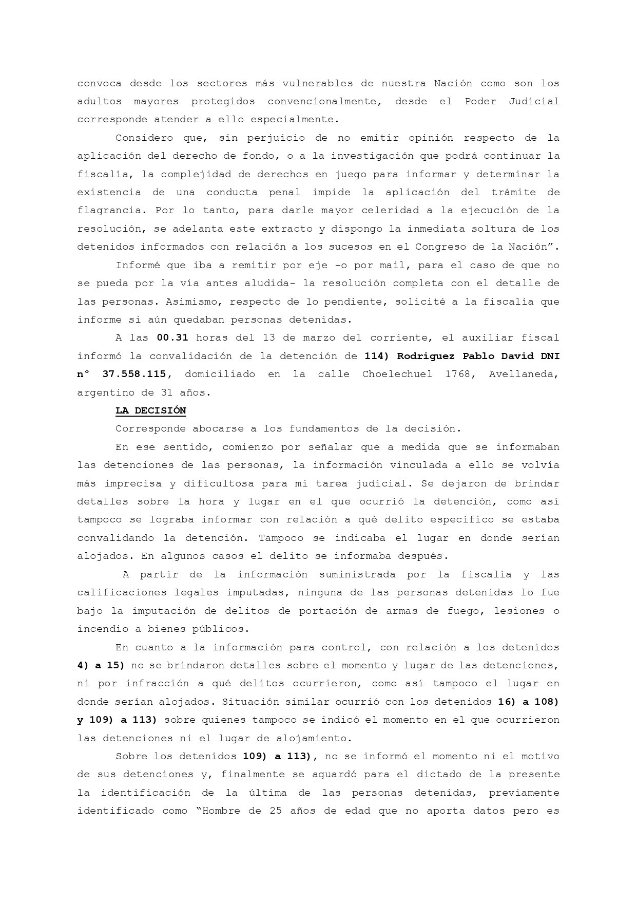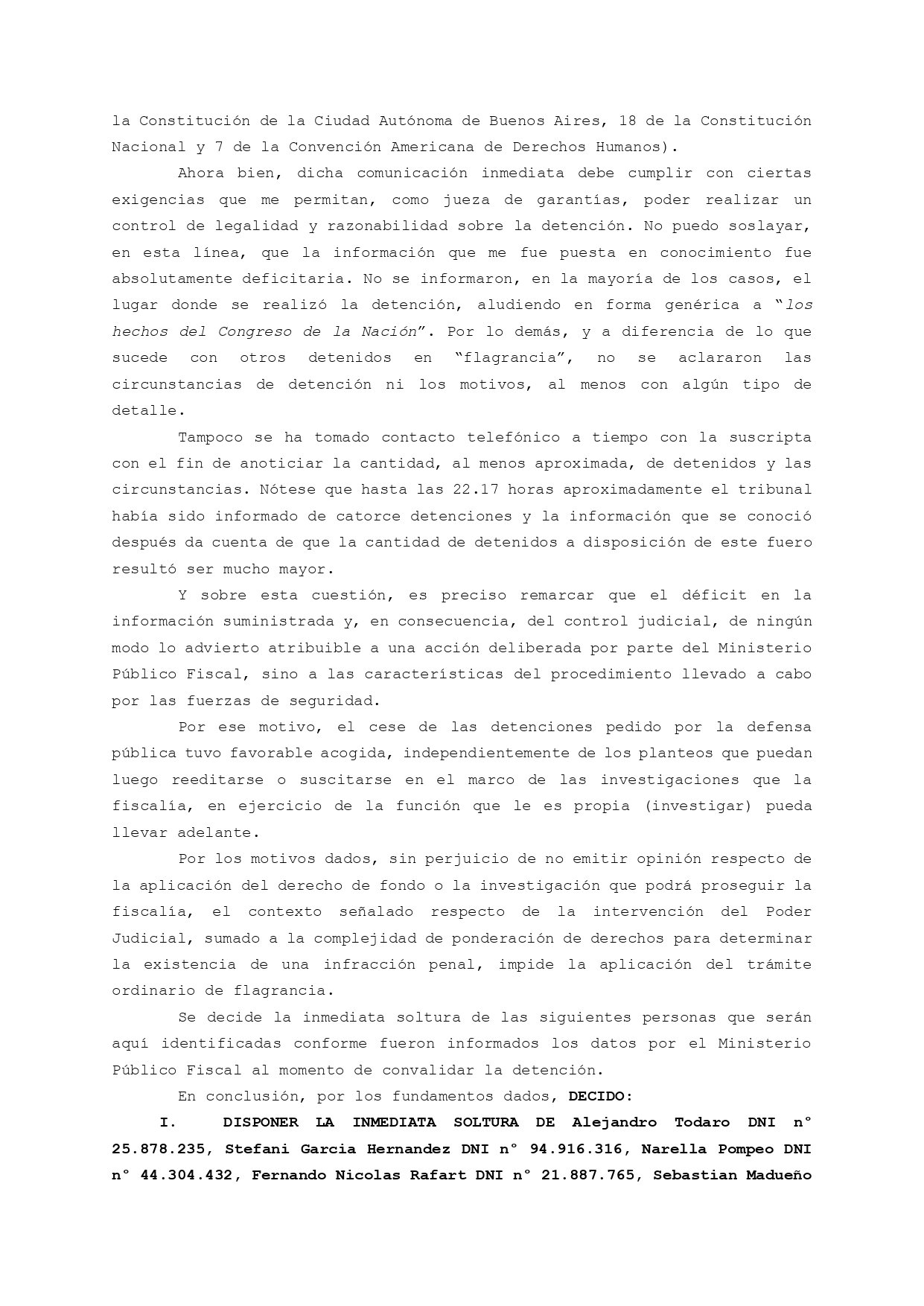 Además, la jueza desmintió a Patricia Bullrich respecto a que los detenidos estuvieran armados o hayan lastimado a los efectivos policiales. «A partir de la información suministrada por la fiscalía y las calificaciones legales imputadas, ninguna de las personas detenidas lo fue bajo la imputación de delitos de portación de armas de fuego, lesiones o incendio a bienes públicos», afirmó.