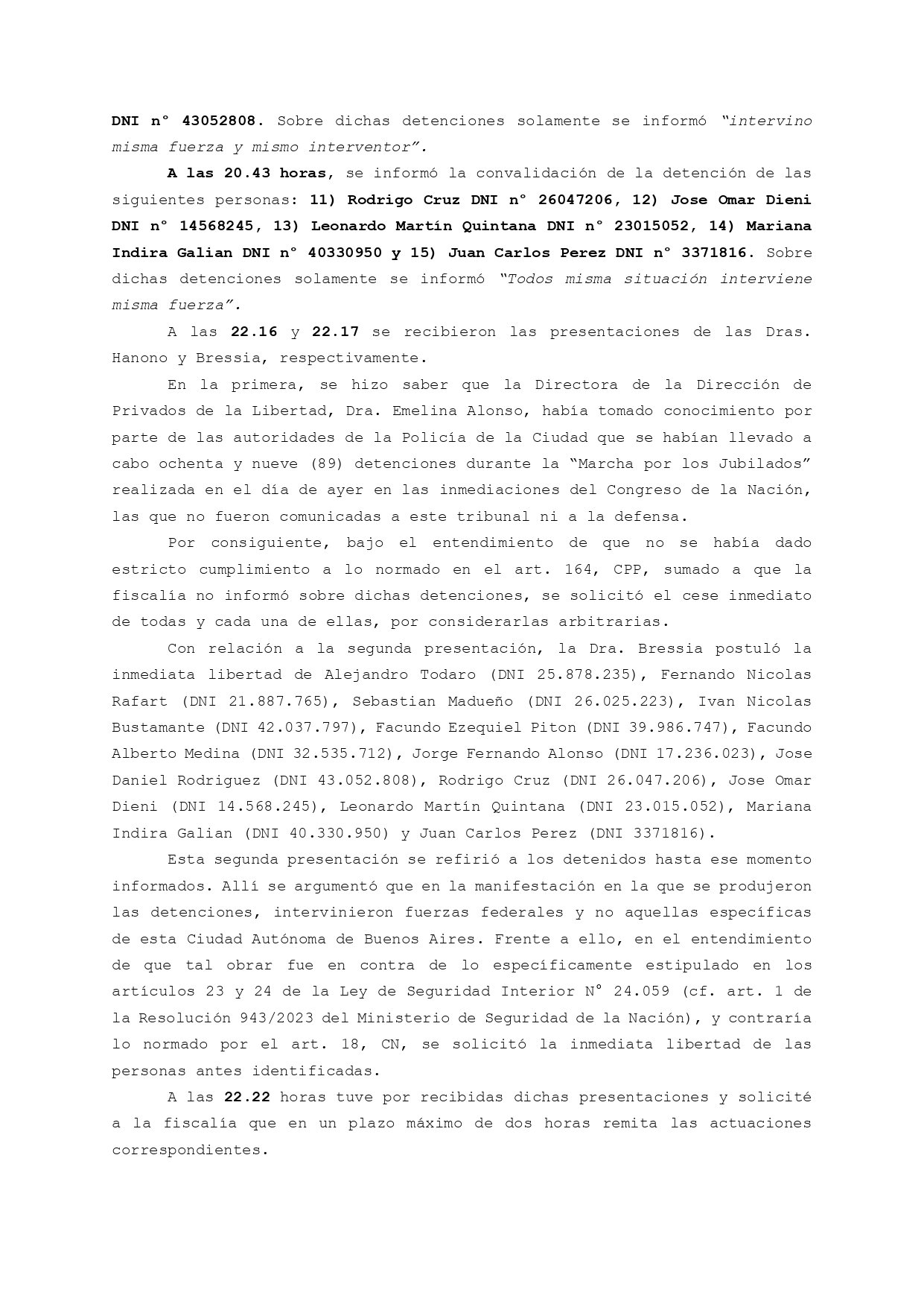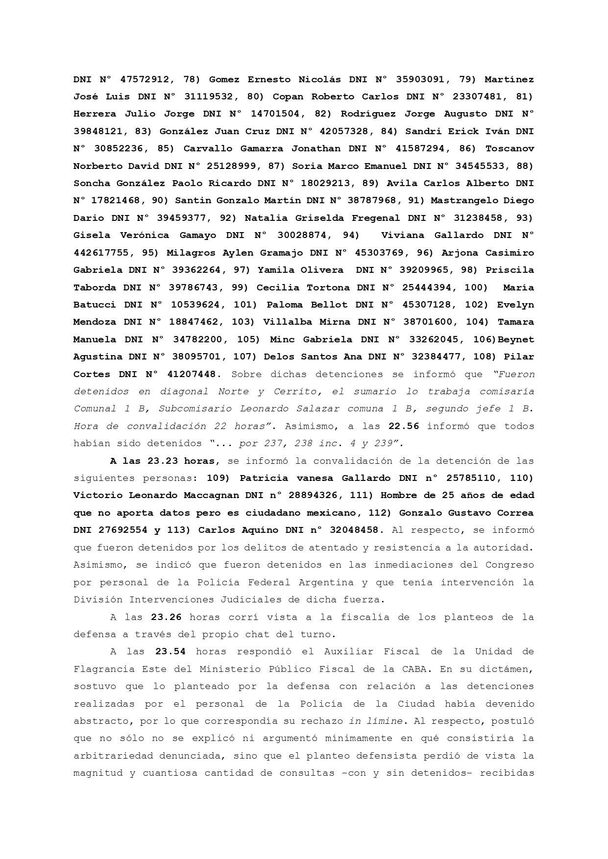 En ese sentido, indicó que «a medida que se informaban las detenciones de las personas, la información vinculada a ello se volvía más imprecisa y dificultosa» por parte de las fuerzas de seguridad.
