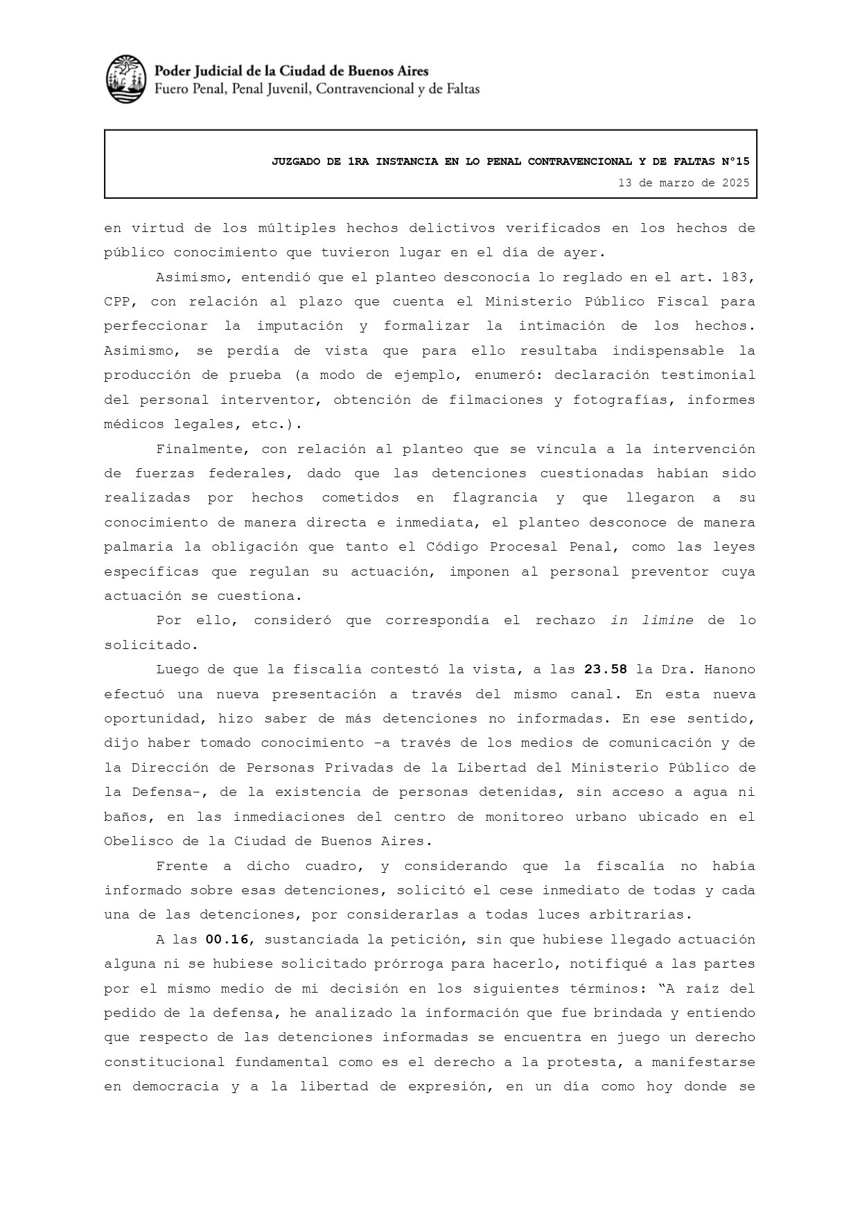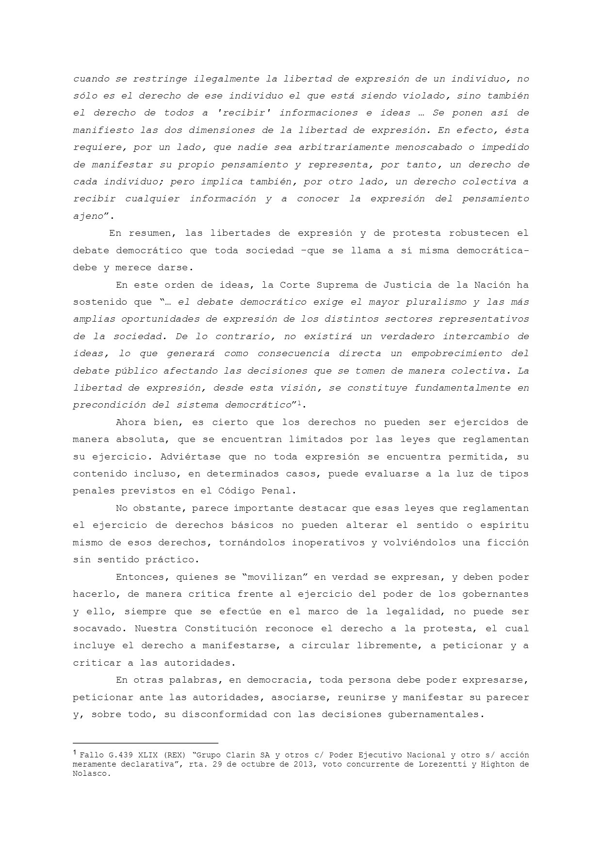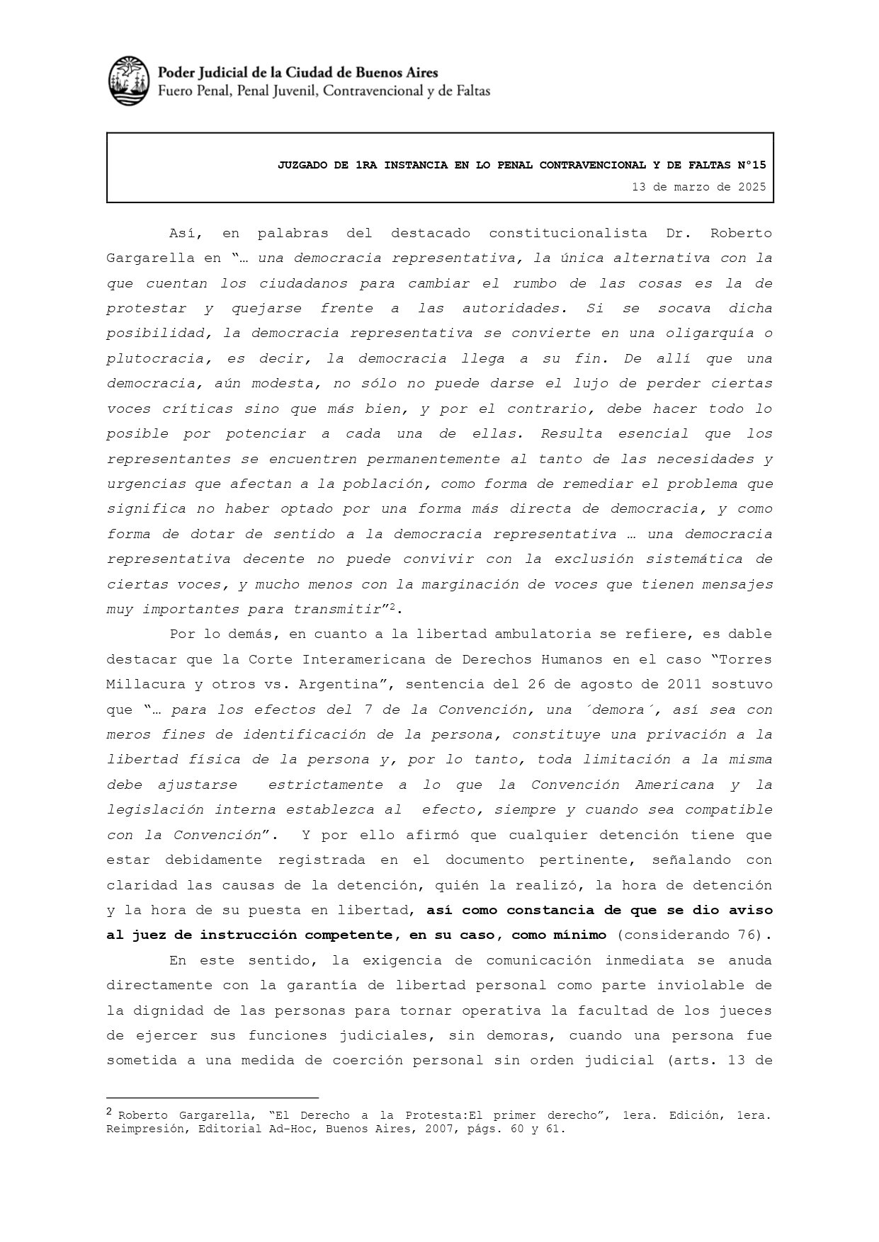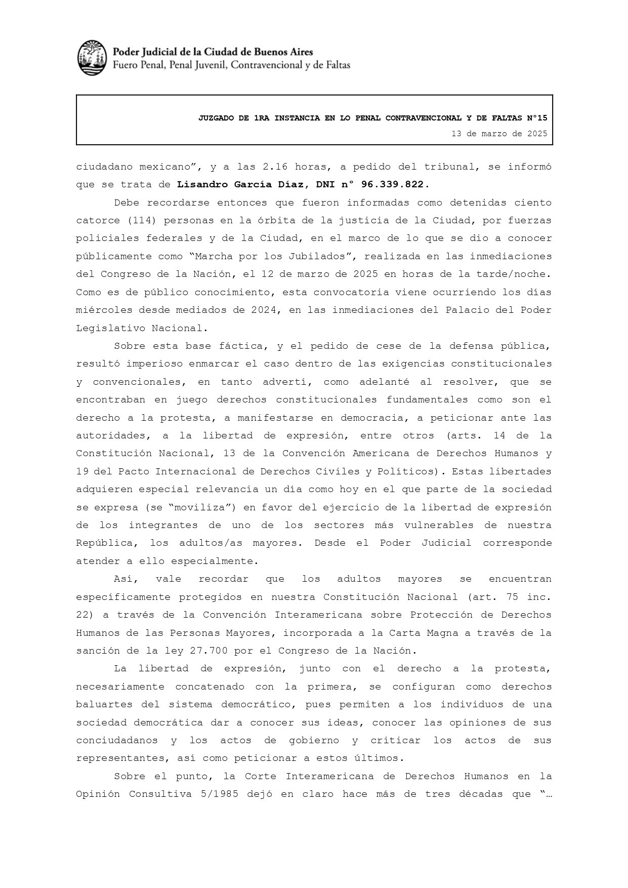 La titular del Juzgado Penal Contravencional y de Faltas 15 de la Ciudad de Buenos Aires sostuvo en su fallo que «se encontraban en juego derechos constitucionales fundamentales como son el derecho a la protesta, a manifestarse en democracia, a peticionar ante las autoridades, a la libertad de expresión, entre otros». Y agregó como un factor clave de su resolución que la convocatoria a la marcha se hizo «desde los sectores más vulnerables de nuestra Nación como son los adultos mayores».