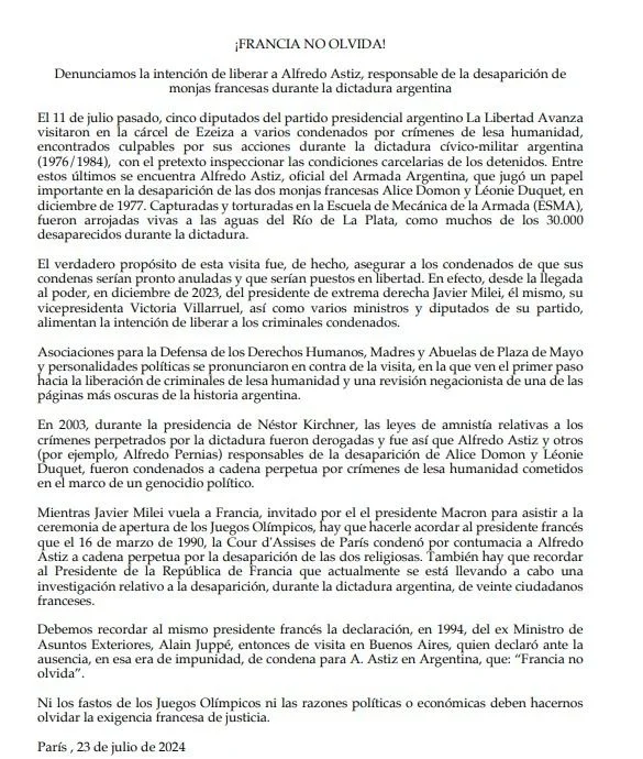 Según denunciaron desde la Asociación, los legisladores nacionales fueron al encuentro de los genocidas “con el pretexto de inspeccionar condiciones carcelarias de los detenidos” e hicieron énfasis en Astiz, el integrante de la Armada conocido como “el Ángel de la muerte”. “Jugó un papel importante” en la desaparición de Domon y Duquet, dijeron, sobre las dos mujeres que fueron capturadas y, luego, torturadas en la ex Escuela de Mecánica de la Armada (ex ESMA) y arrojadas vivas a las aguas del Río de la Plata, “como muchos de los 30 mil desaparecidos durante la dictadura”. En el comunicado especificaron también que el 16 de marzo de 1990, la Cour d’Assises de París condenó a Astiz en ausencia a cadena perpetua por la desaparición de las dos religiosas. Ese dato, dijeron, vale “recordarle” al presidente de Francia, Emmanuel Macron, cuando faltan pocos días para que reciba a su par argentino, Javier Milei, en el marco de la apertura de los Juegos Olímpicos, que se disputarán en París. “También hay que recordar que actualmente se está llevando a cabo una investigación relativo a la desaparición, durante la dictadura argentina, de veinte ciudadanos franceses”, precisaron.