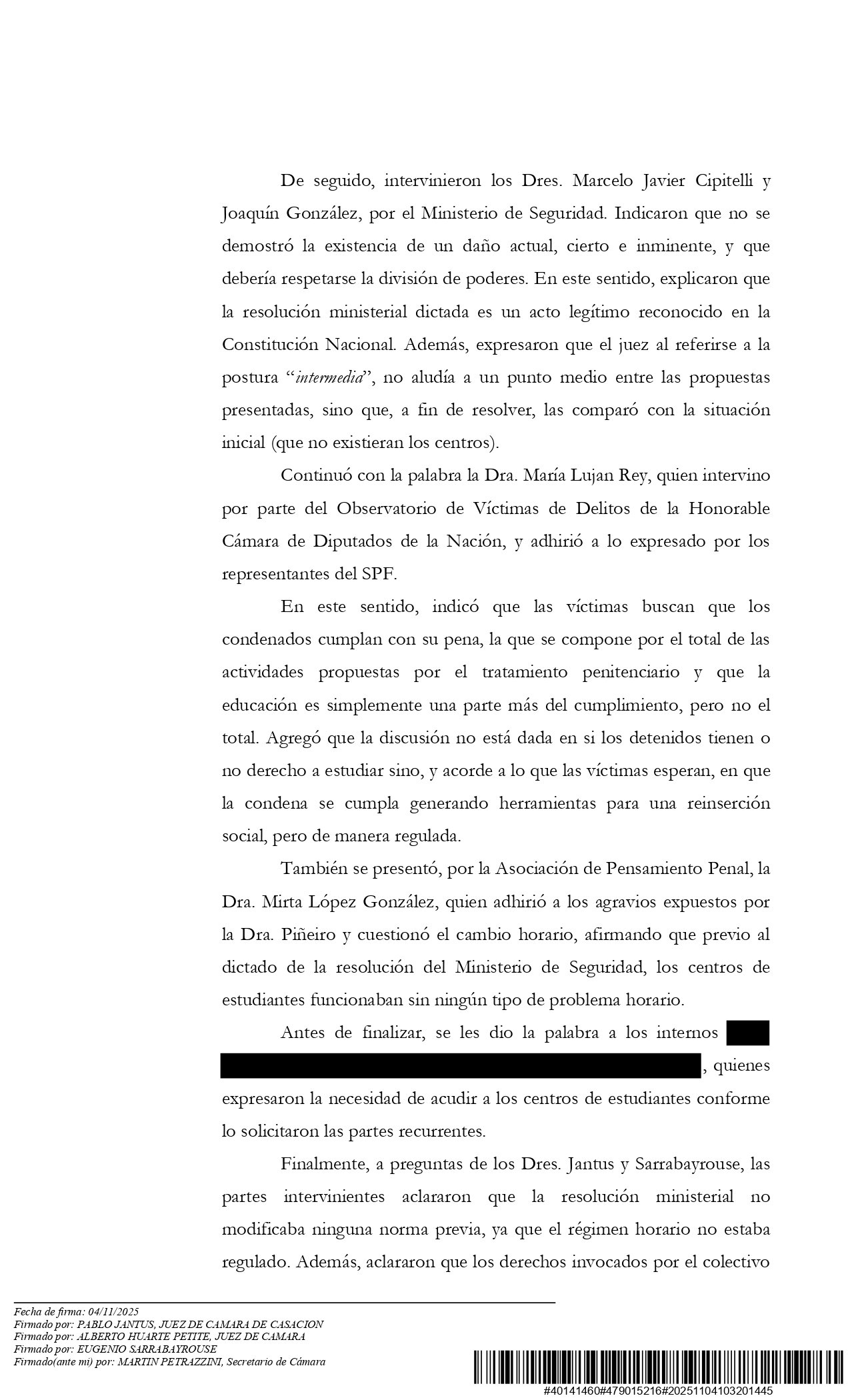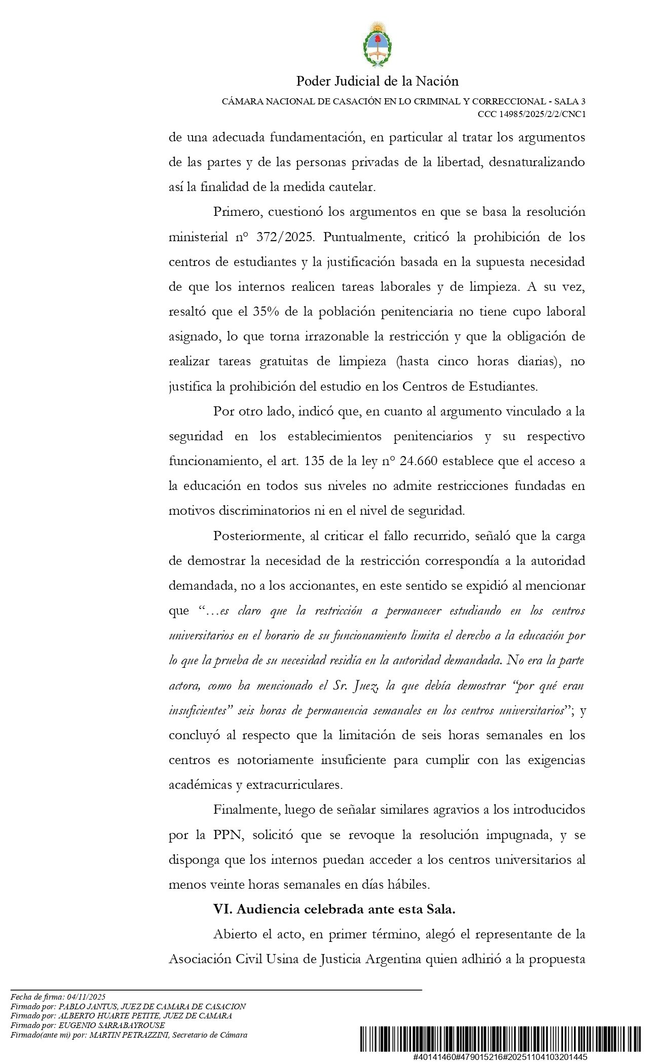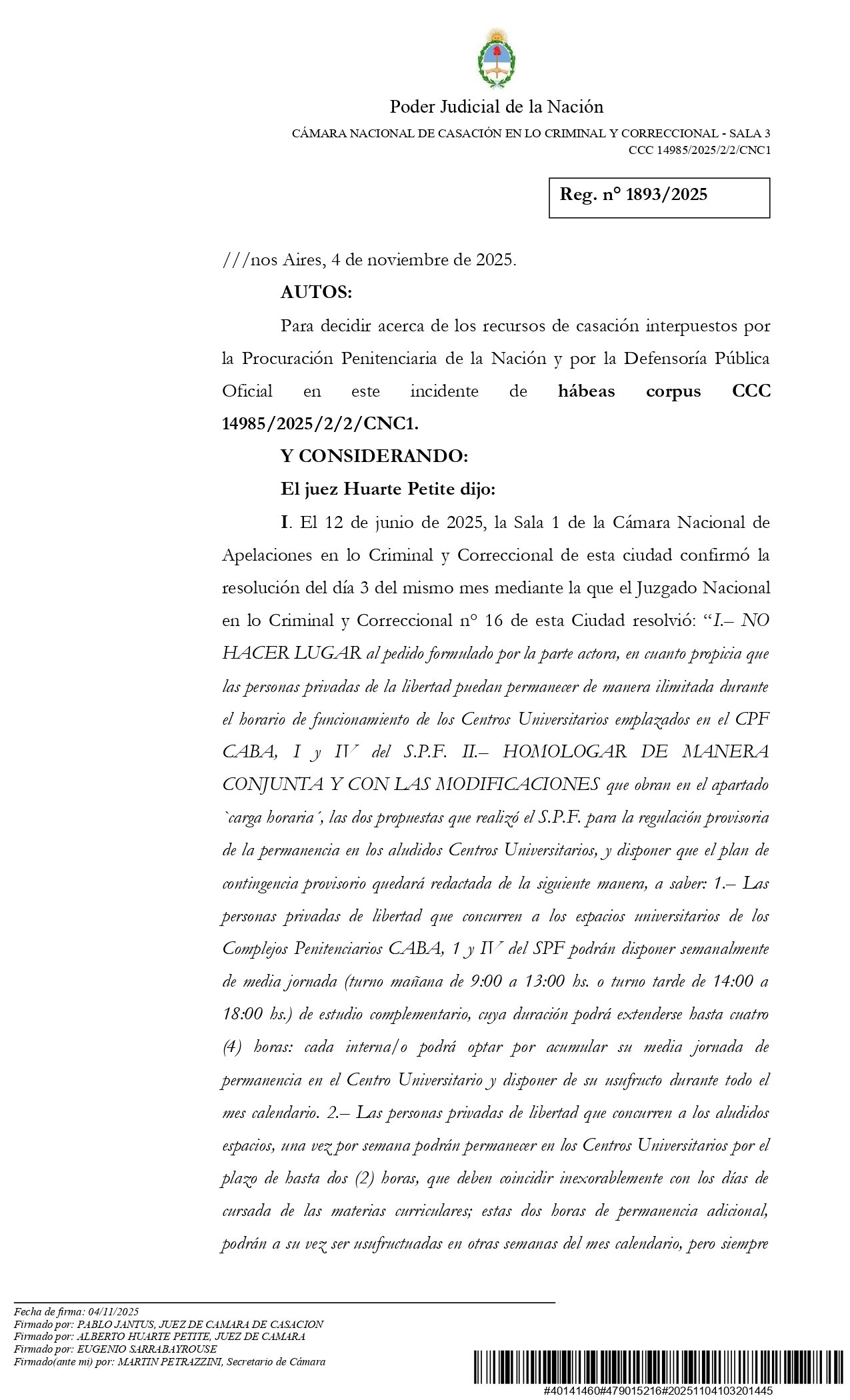 Cabe destacar que este primer magistrado había validado la propuesta del SPF de reducir el horario de permanencia en los centros de estudiantes de las cárceles federales a solo seis hora semanales. Fue cuando el Ministerio de Seguridad de la Nación -dirigido por Patricia Bullrich- dictó la Resolución 372/2025.