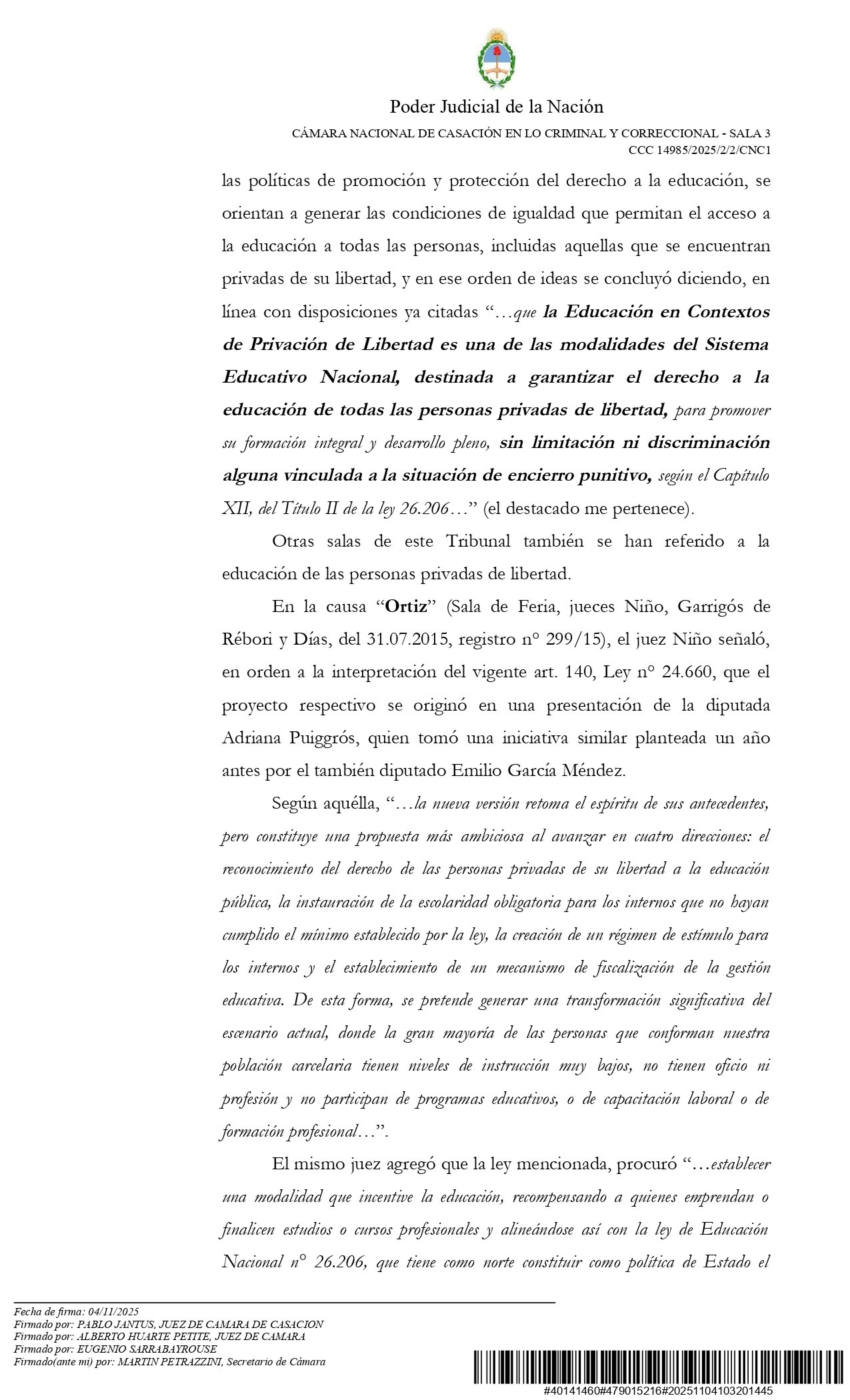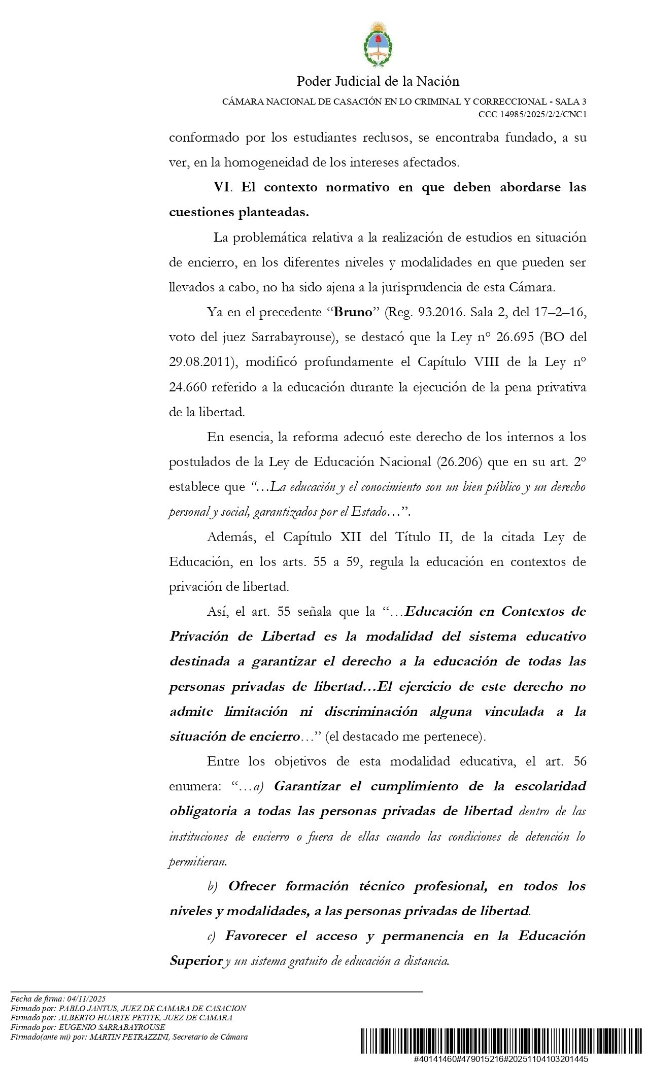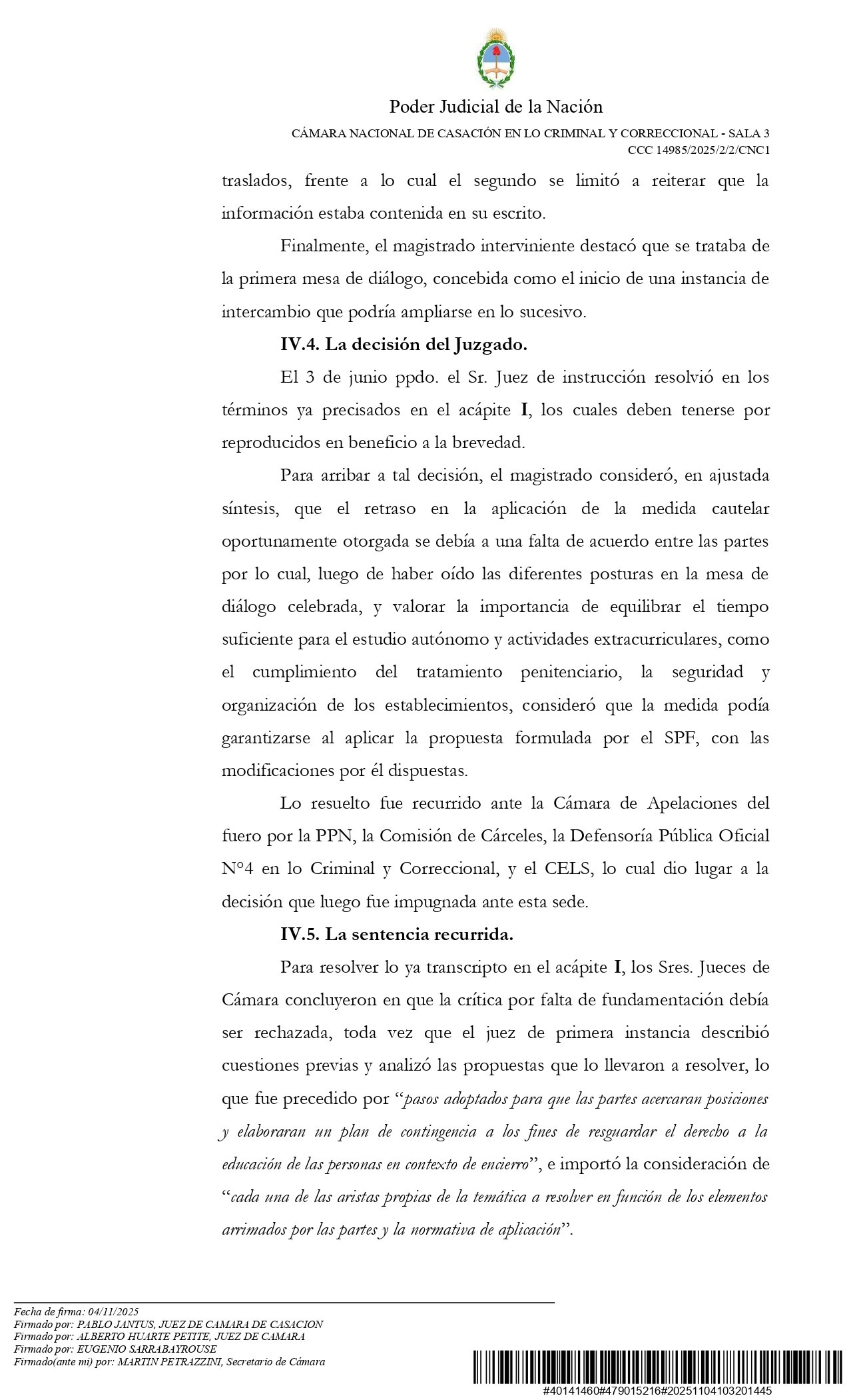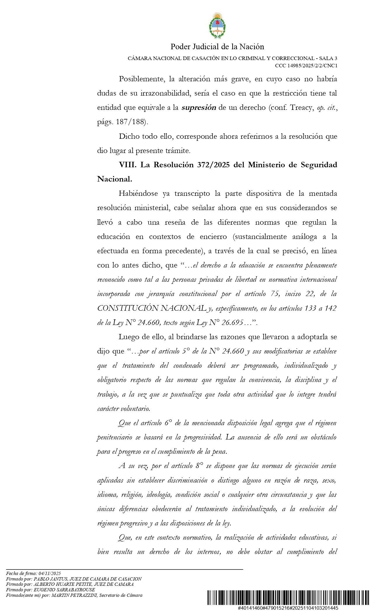 Cabe destacar que este primer magistrado había validado la propuesta del SPF de reducir el horario de permanencia en los centros de estudiantes de las cárceles federales a solo seis hora semanales. Fue cuando el Ministerio de Seguridad de la Nación -dirigido por Patricia Bullrich- dictó la Resolución 372/2025.