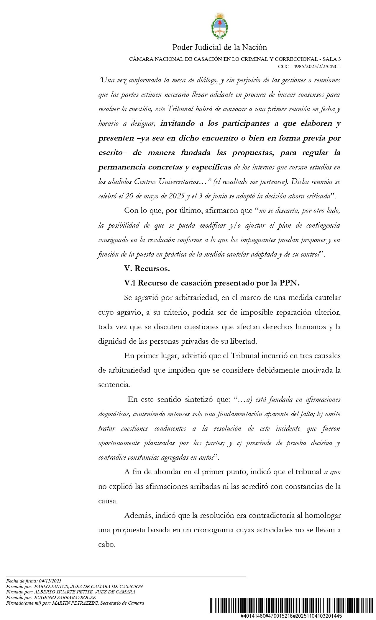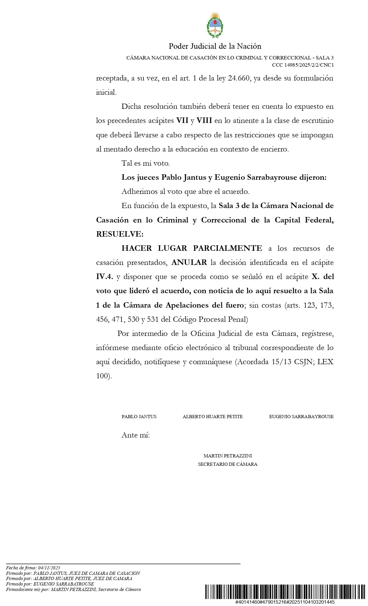 Entonces, la Procuración y la Defensoría presentaron un recurso de apelación que fue rechazado. Y luego, el recurso de casación que se conoció la semana pasada de la Sala III de la Cámara Nacional de Casación en lo Criminal y Correccional; que anuló la medida ministerial restrictiva.