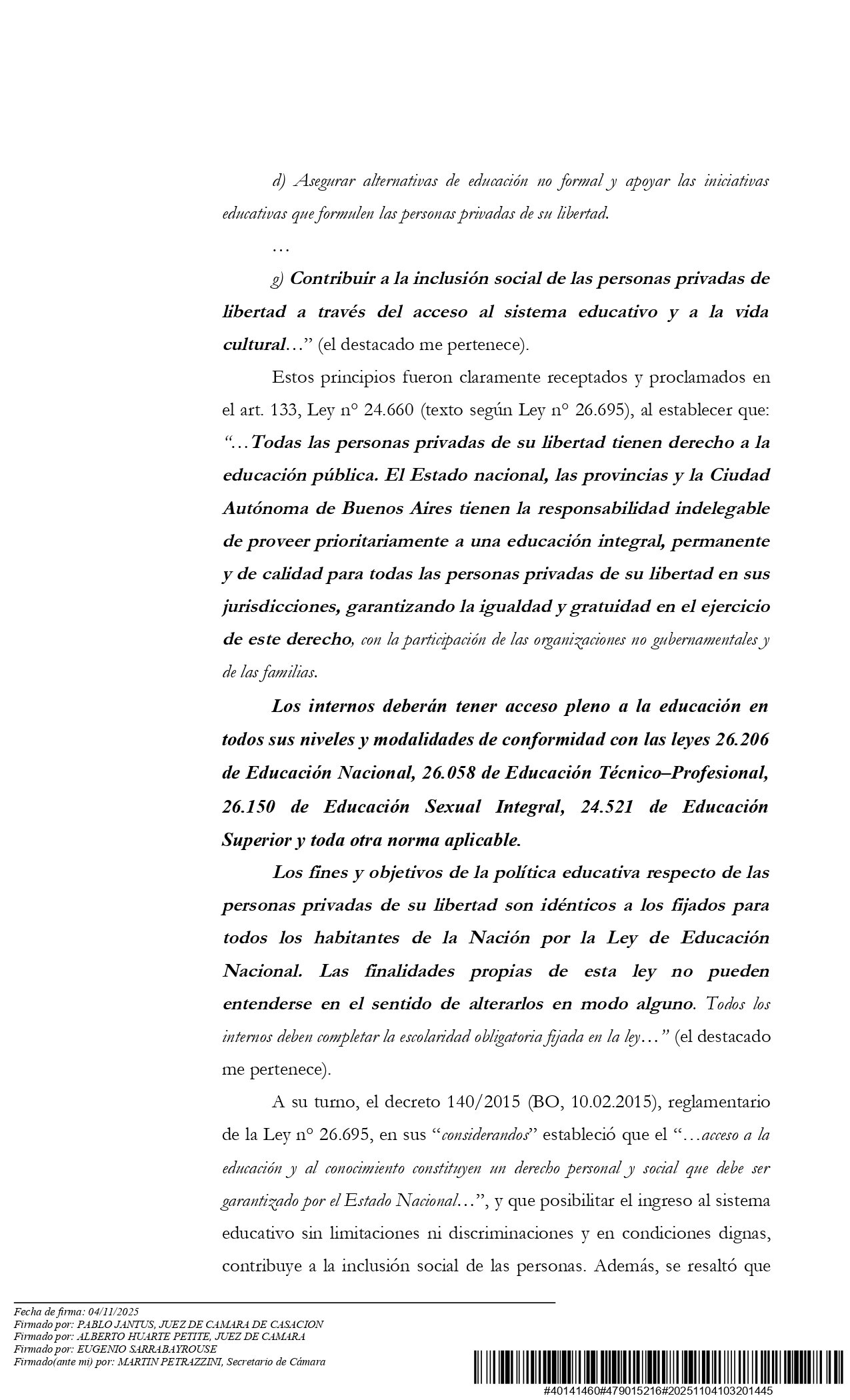 Cejas Meliare argumentó que esas medidas cercenaban el derecho a la educación universitaria, ya que impedían a las personas detenidas estudiar fuera de los pabellones que habitan. También a utilizar computadoras y bibliotecas, así como participar en actividades investigación, extensión universitaria y otras propuestas extracurriculares.