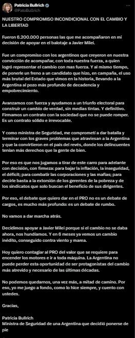 En la misiva que lleva el título «Nuestro compromiso incondicional con el cambio y la libertad», Bullrich se jactó de tener el respaldo de los » 6.200.000 de personas» la votaron en la última elección donde quedó en tercer lugar detrás de Milei y Sergio Massa, y la dejó afuera del balotaje presidencial.