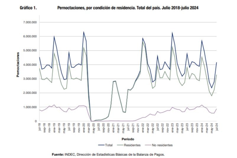 A nivel nacional, el INDEC estimó que de enero a julio hubo 26.644.952 pernoctaciones a en el país. Mientras que en 2023 en el mismo periodo se había registrado un total de 30.651.244, entre residentes y extranjeros.