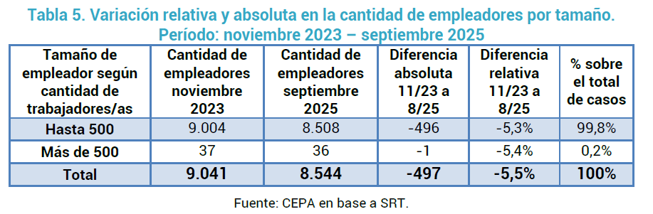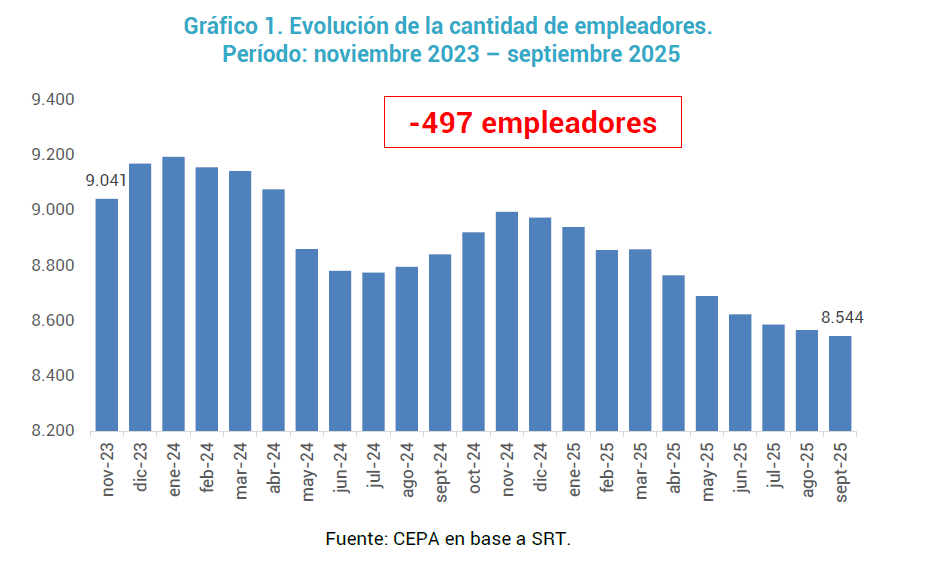 El informe traza un panorama preocupante: la cantidad de empleadores con personal registrado pasó de 9.041 a 8.544, lo que representa una caída del 5,5% del entramado empresarial formal en la provincia. La contracción no fue homogénea: golpeó con mayor fuerza a las pequeñas y medianas empresas, que explican el 99,8% de los cierres registrados en el período.