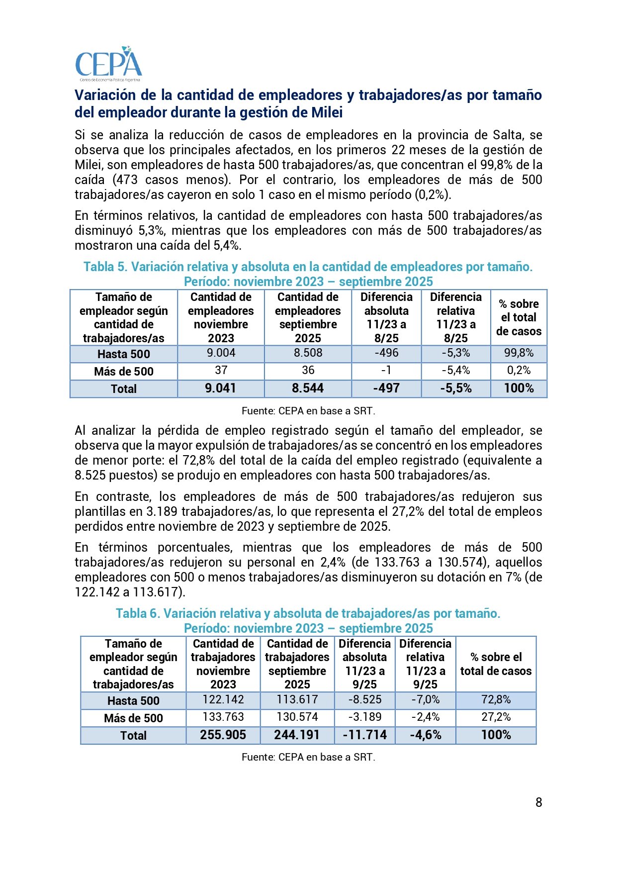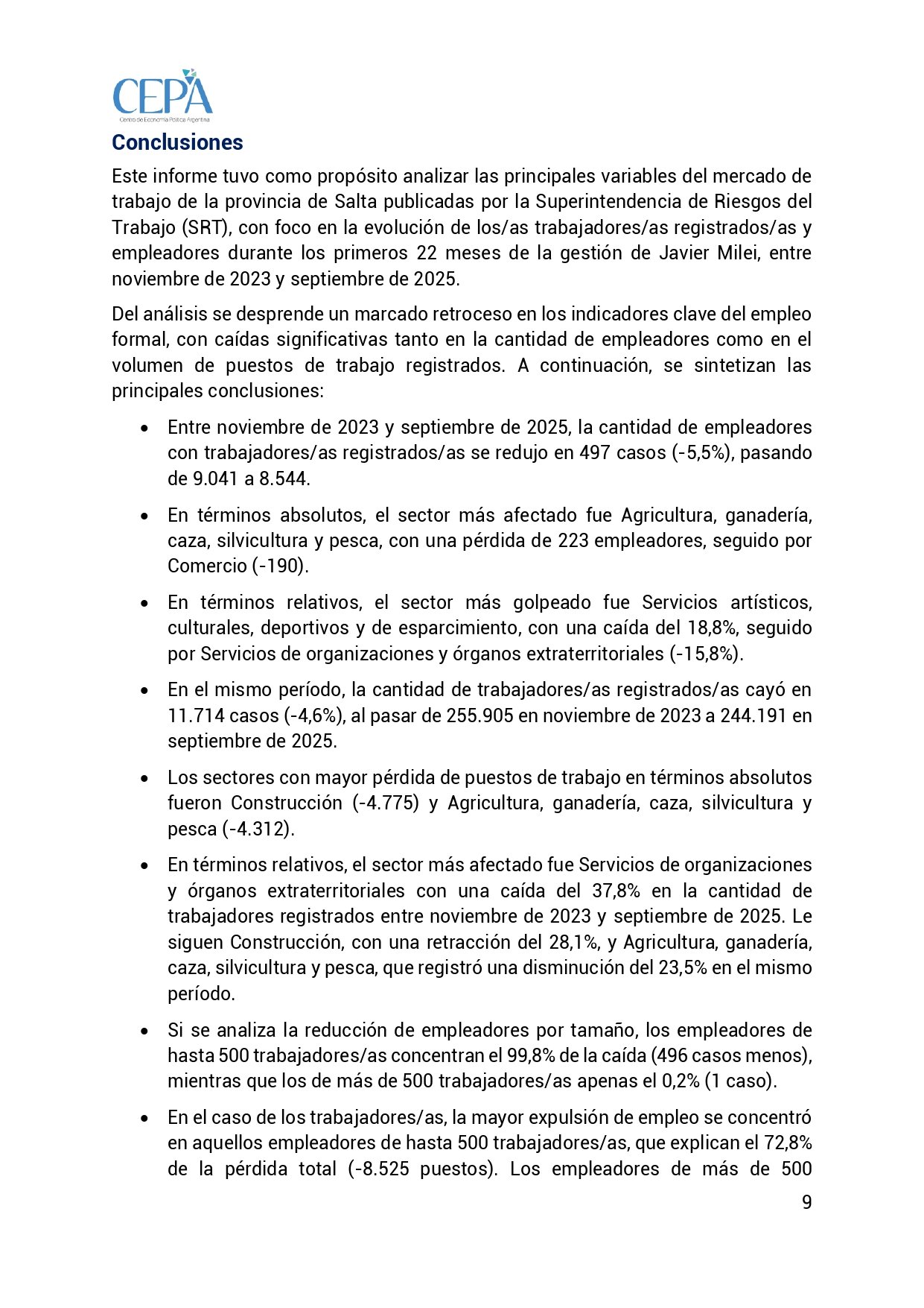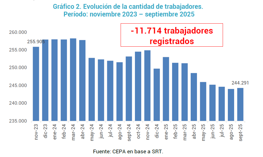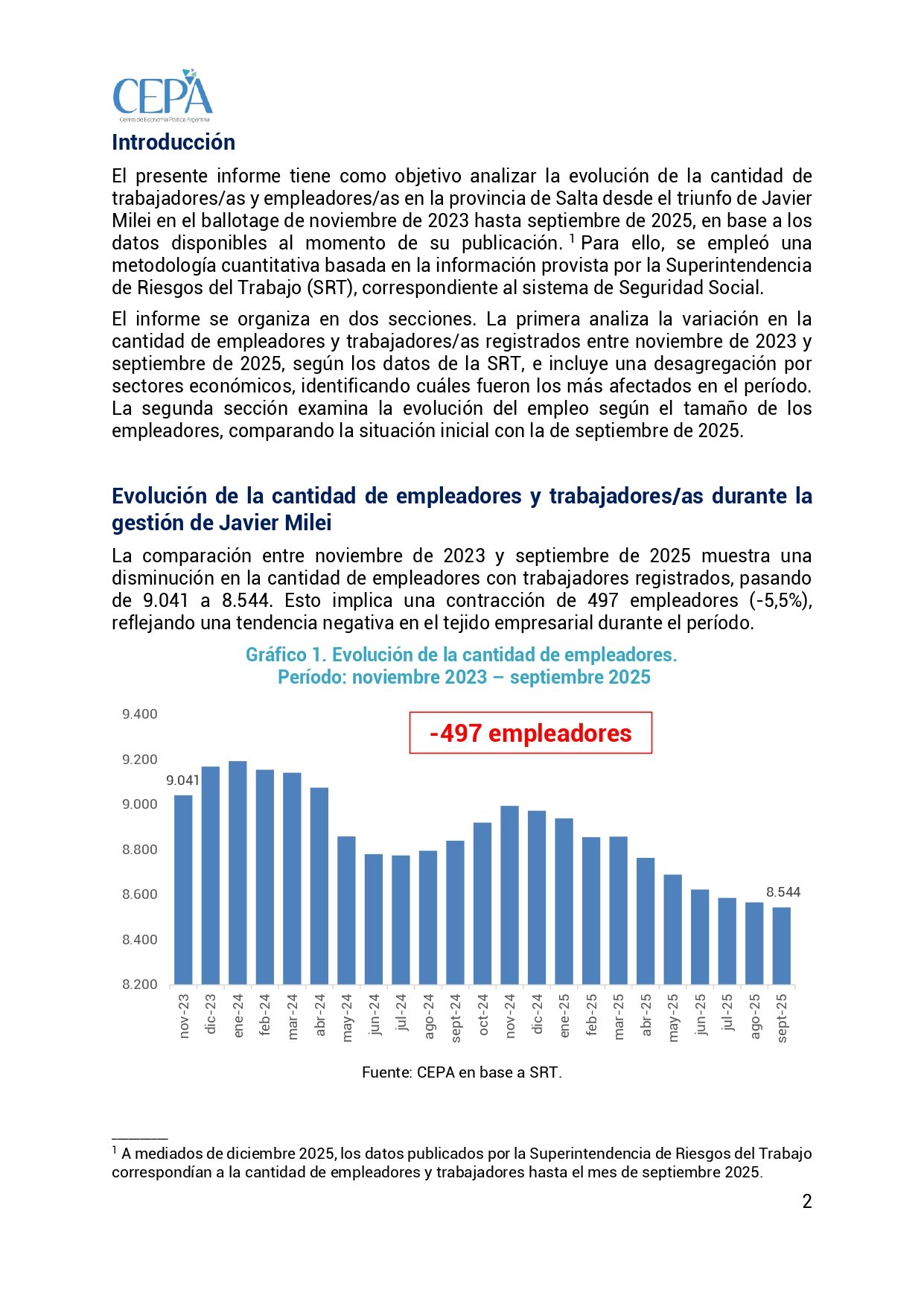 La provincia de Salta atraviesa uno de los períodos más delicados en materia laboral de los últimos años. Entre noviembre de 2023 y septiembre de 2025, durante los primeros 22 meses de la presidencia de Javier Milei, se perdieron 11.714 puestos de trabajo registrados y cerraron 497 empleadores, según un informe elaborado por el Centro de Economía Política Argentina (CEPA) en base a datos oficiales de la Superintendencia de Riesgos del Trabajo (SRT).