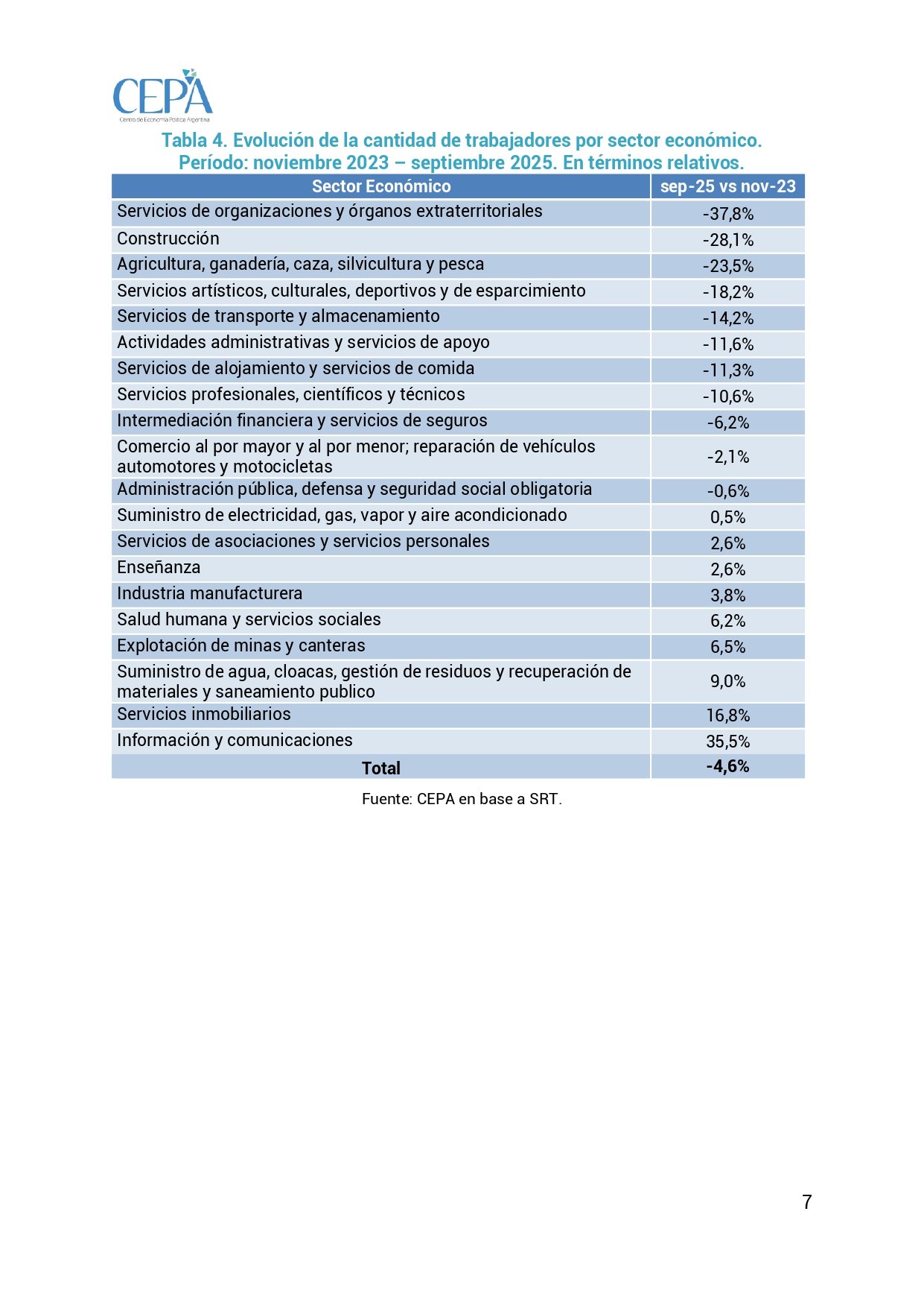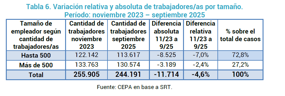 El informe remarca un dato clave: el ajuste no fue parejo. El 72,8% de los empleos perdidos se concentró en empleadores de hasta 500 trabajadores, es decir, en PyMEs y emprendimientos locales. En ese segmento se destruyeron 8.525 puestos de trabajo, mientras que las grandes empresas explicaron el 27,2% restante.