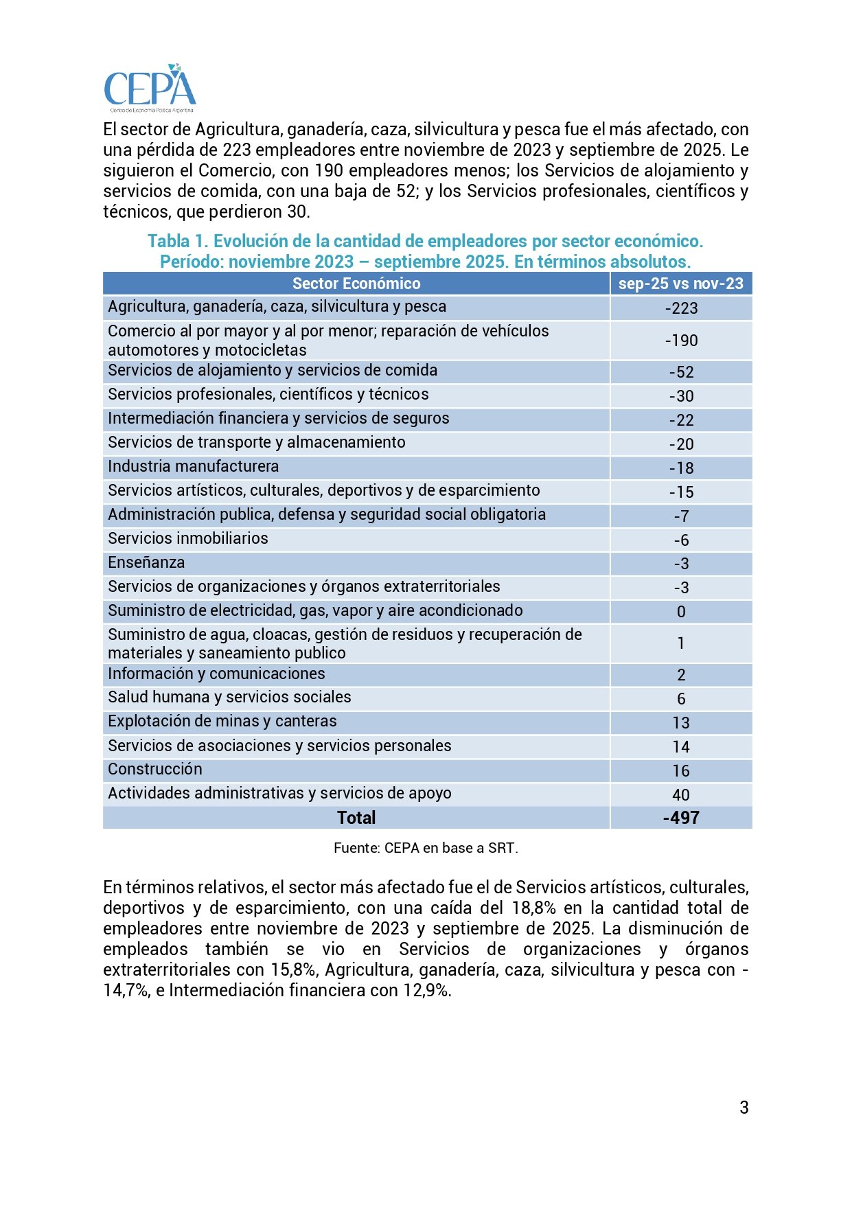 Si se observa el impacto relativo, el derrumbe es aún más severo en sectores vinculados a la cultura y la economía social. Los servicios artísticos, culturales, deportivos y de esparcimiento encabezaron la caída con una baja del 18,8% en la cantidad de empleadores, seguidos por organizaciones extraterritoriales y el sector agropecuario.
