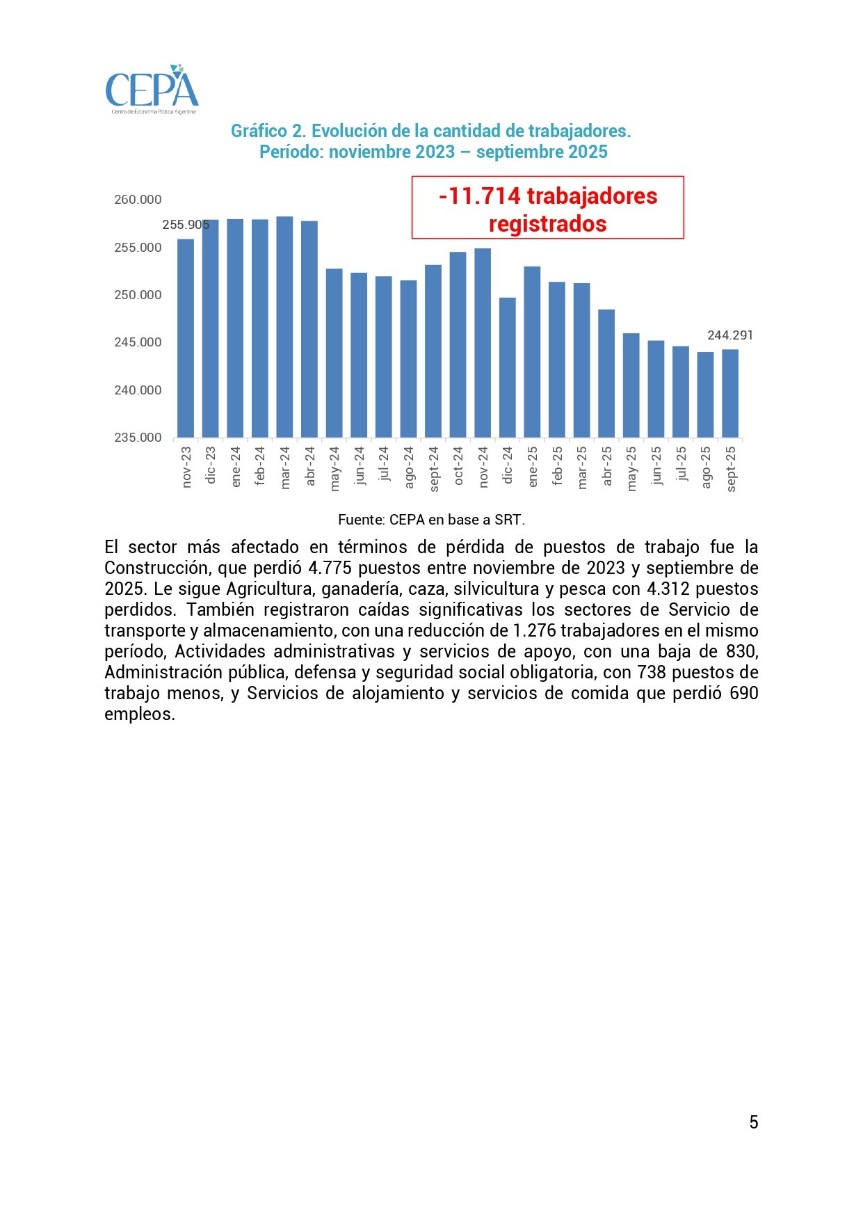 El deterioro empresarial tuvo su correlato directo en el empleo. La cantidad de trabajadores registrados cayó un 4,6%, pasando de 255.905 a 244.191 personas con empleo formal. La Construcción fue el sector más golpeado, con la pérdida de 4.775 puestos de trabajo, seguida por el agro, que expulsó a 4.312 trabajadores del sistema formal.