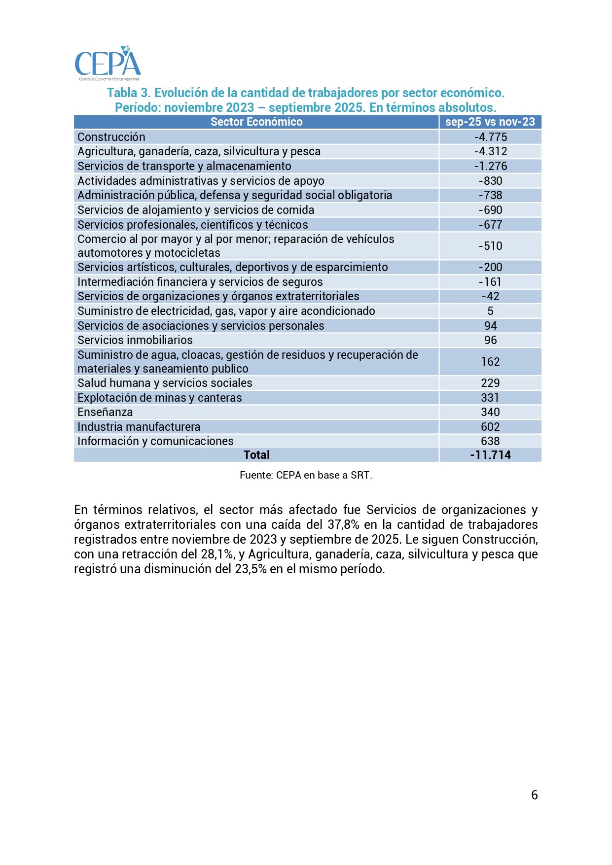 También se registraron caídas significativas en transporte, administración pública, actividades administrativas y servicios de apoyo, y gastronomía, configurando un escenario de ajuste transversal que afectó tanto al sector privado como al público.