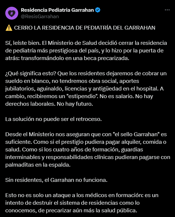 «Sí, leíste bien. El Ministerio de Salud decidió cerrar la residencia de pediatría más prestigiosa del país, y lo hizo por la puerta de atrás: transformándolo en una beca precarizada». ¿Qué significa esto? Que los residentes dejaremos de cobrar un sueldo en blanco, no tendremos obra social, aportes jubilatorios, aguinaldo, licencias y antigüedad en el hospital. A cambio, recibiremos un «estipendio». No es salario. No hay derechos laborales. No hay futuro».
