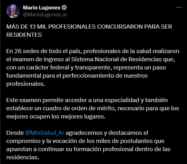 Un día antes de la medida ocurrió el examen de residencias, con la participación de más de 13 mil postulantes. En ese momento, el ministro de Salud, Mario Lugones, destacó al conjunto de residentes: «agradecemos y destacamos el compromiso y la vocación de los miles de postulantes que apuestan a continuar su formación profesional dentro de las residencias». Al día siguiente vino la resolución.