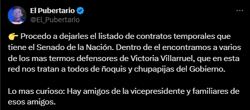 «Procedo a dejarles el listado de contratos temporales que tiene el Senado de la Nación. Dentro de él encontramos a varios de los más termos defensores de Victoria Villarruel, que en esta red nos tratan a todos de ñoquis y chupapijas del Gobierno. Lo más curioso: Hay amigos de la vicepresidente y familiares de esos amigos», decía ese mensaje.
