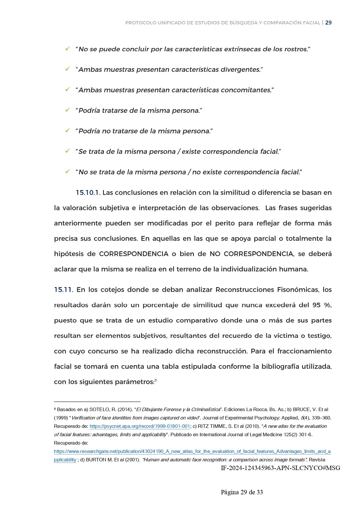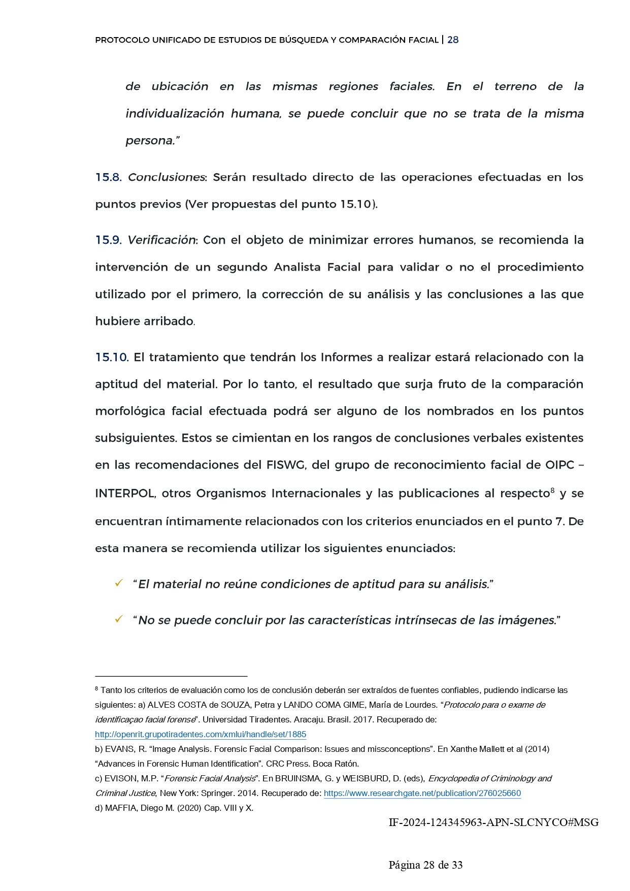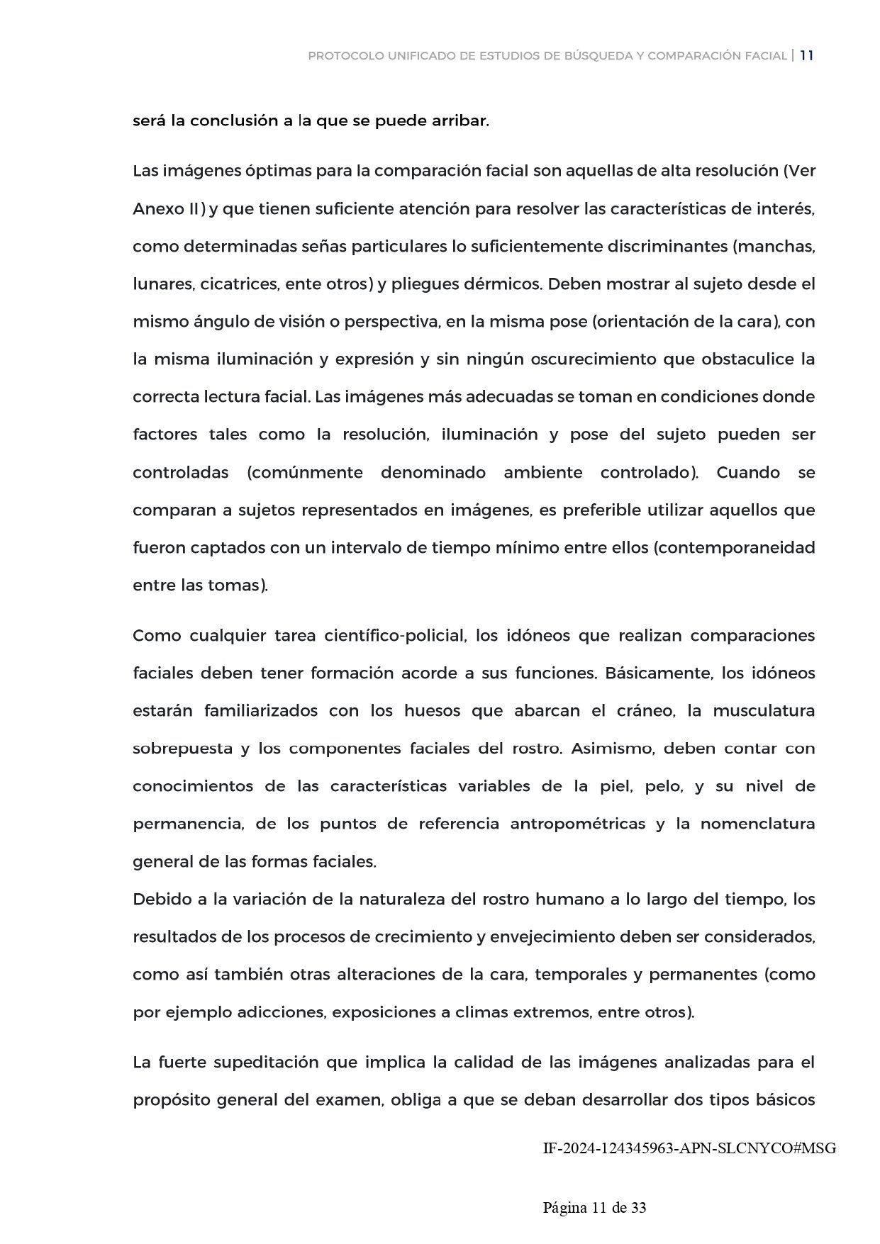 - El protocolo se alinea con estándares internacionales, basándose en guías de buenas prácticas para asegurar la fiabilidad y precisión en las comparaciones de imágenes faciales.