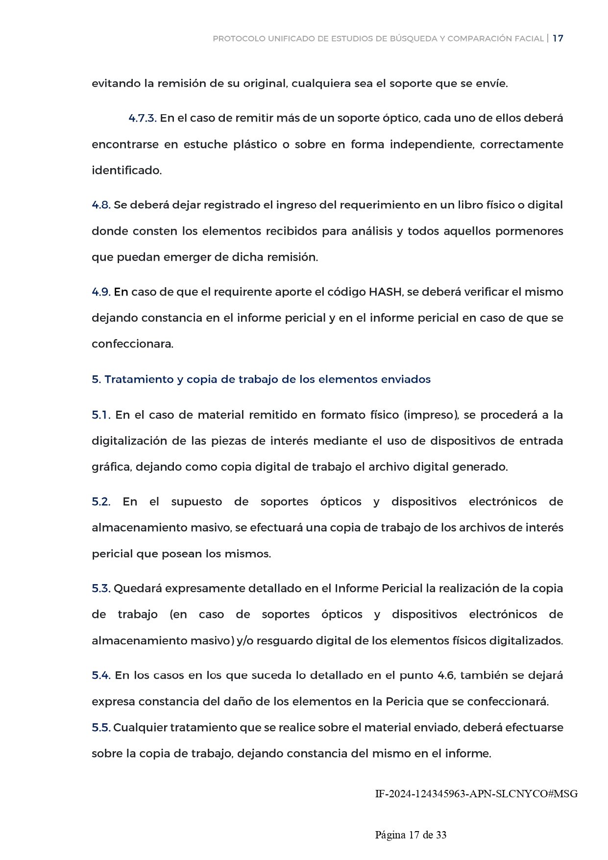 El protocolo aprobado tiene carácter obligatorio para todas las fuerzas federales, lo que implica que Gendarmería Nacional, Prefectura Naval Argentina, Policía de Seguridad Aeroportuaria y Policía Federal deben aplicar estos procedimientos en sus investigaciones. Esto significa que los agentes contarán con instrucciones claras sobre cómo llevar adelante los estudios de reconocimiento y comparación facial, incluyendo indicaciones sobre cuándo y cómo actuar para asegurar la calidad del trabajo forense.