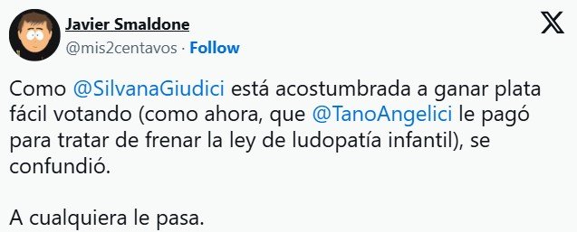 “Las encuestas refieren que la mayor parte de los chicos, y en consonancia a lo que pasa en la mayoría de las familias, votan, digo juegan, porque consideran que ésta es una manera efectiva de ganar plata fácil”, dijo Giudici que confundió el verbo votar con jugar. Fue en medio del debate en el que previamente defendió el dictamen de minoría, ya que no acompañó uno de los artículos clave que prohíbe la publicidad, promoción y patrocinio de los juegos de azar y de apuestas en línea.