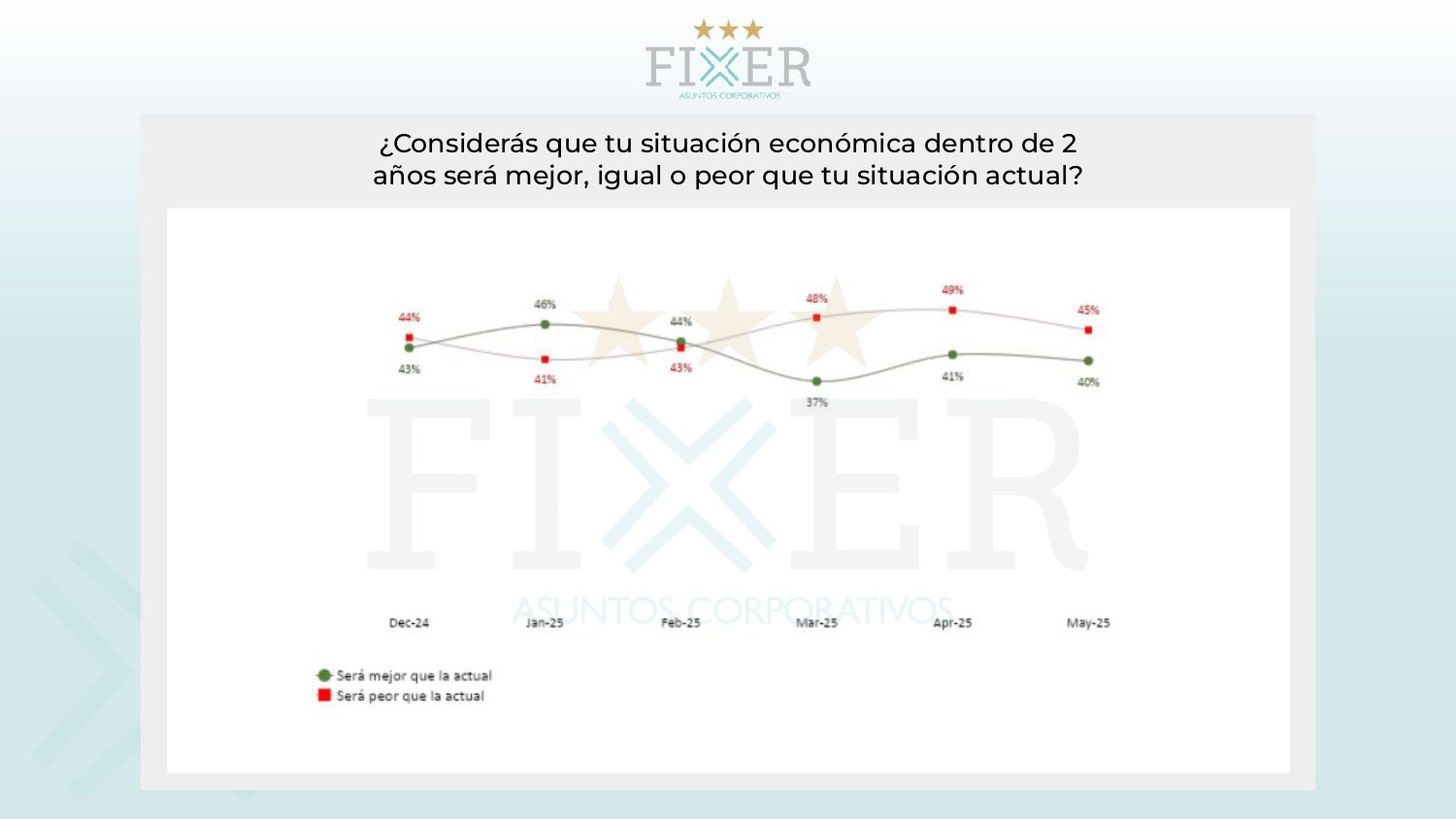 El empeoramiento de la economía personal coincide con un registro de baja de la inflación. Las expectativas de inflación cayeron más de 10 puntos de abril. Pero respecto al futuro también hubo un empeoramiento de las expectativas. El 40% cree que en dos años su situación será mejor que la actual, 6% menos que en enero. Quienes piensan que estarán peor subieron del 41% al 45%.