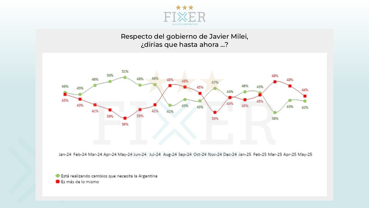 El 44% de los consultado cree que el gobierno de Milei es «más de lo mismo», una cifra muy similar a la de enero (43%). Aquellos que piensan que Milei «está realizando los cambios que necesita la Argentina» pasaron del 46% en enero al 42% en mayo.