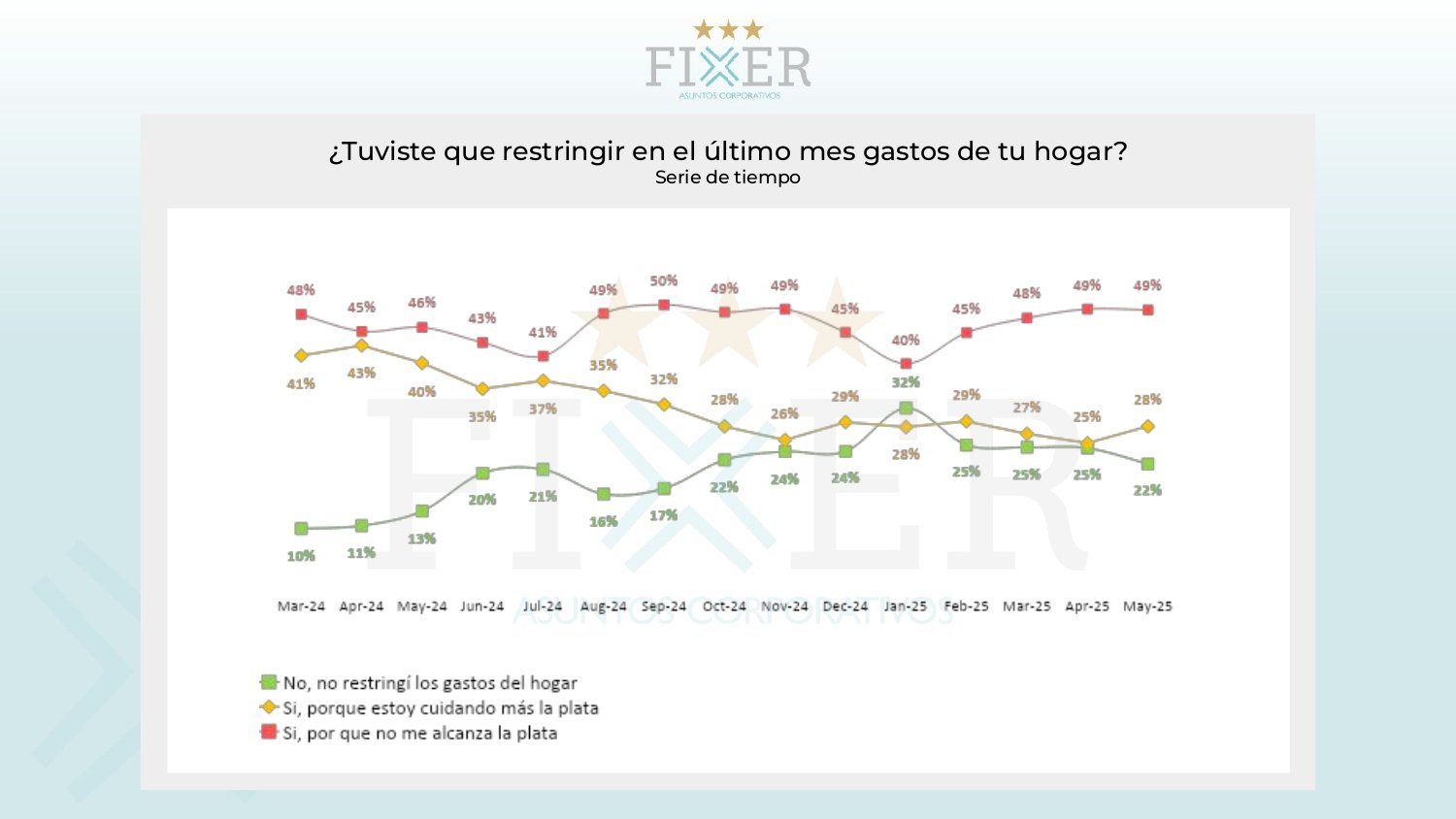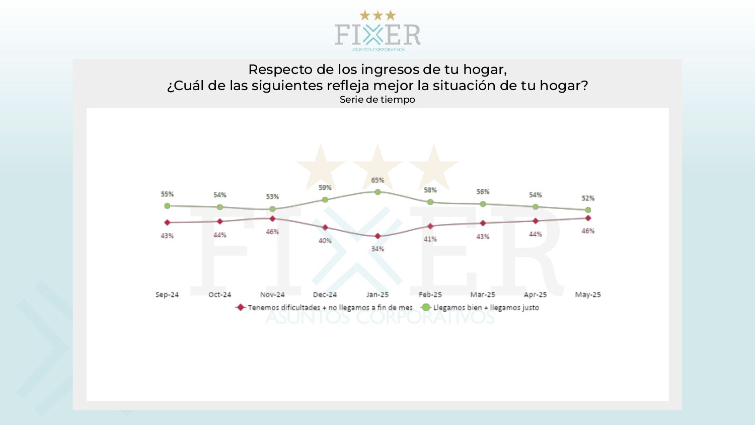 En enero, el 65% de los consultados decía que llegaba «bien o justo» a fin de mes, en mayo ese número bajó al 52%. Mientras que el porcentaje de los que tienen dificultades y no llegan a fin de mes pasó del 34% en enero al 46% en mayo.
