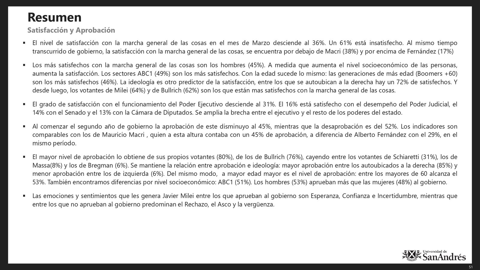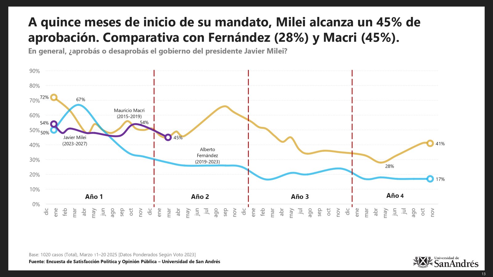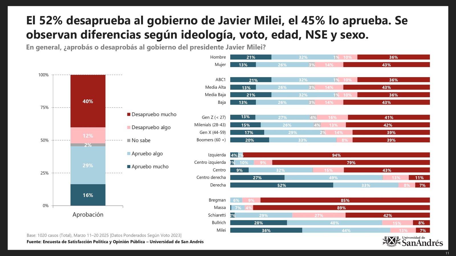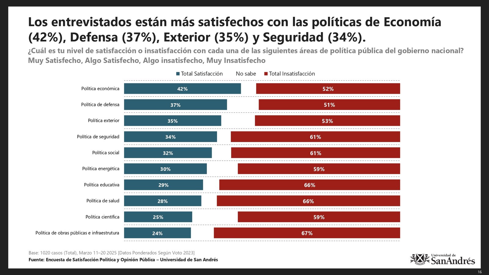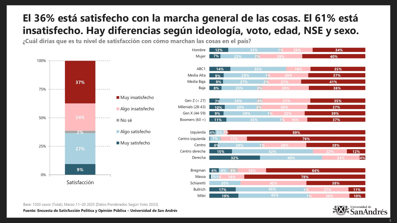 Un estudio de la Universidad de San Andrés muestra que Milei debe revertir un 61% de insatisfacción con su gobierno.