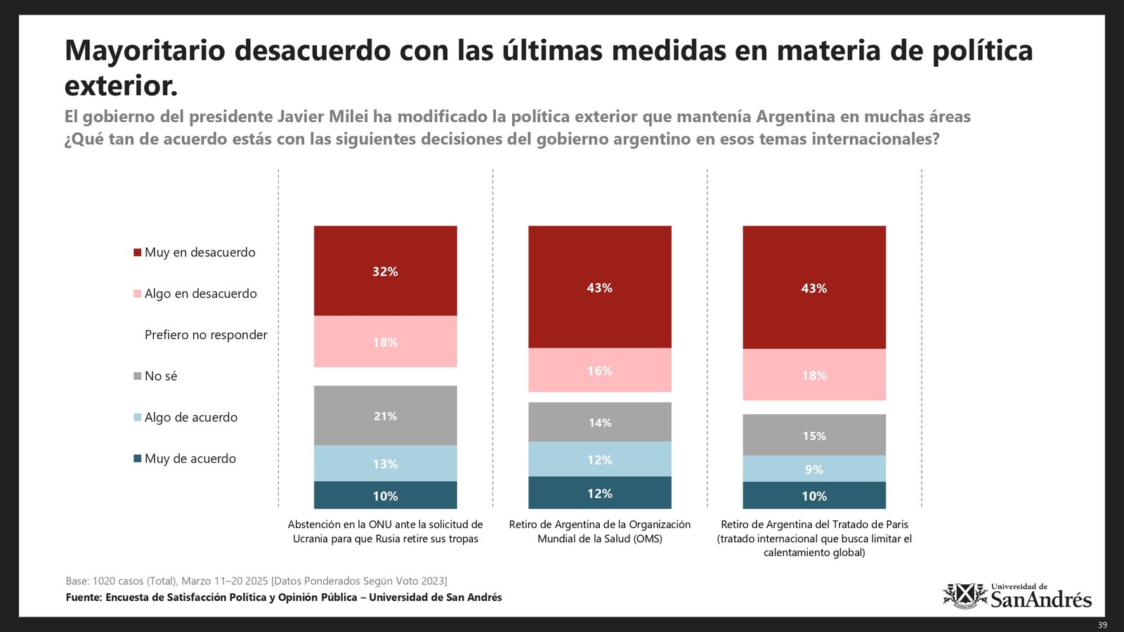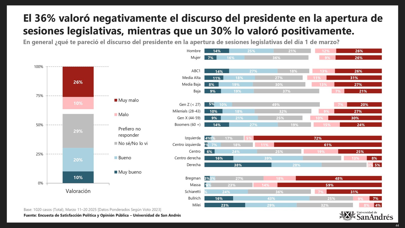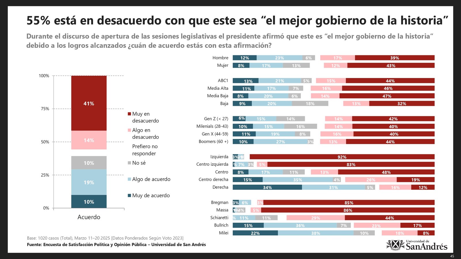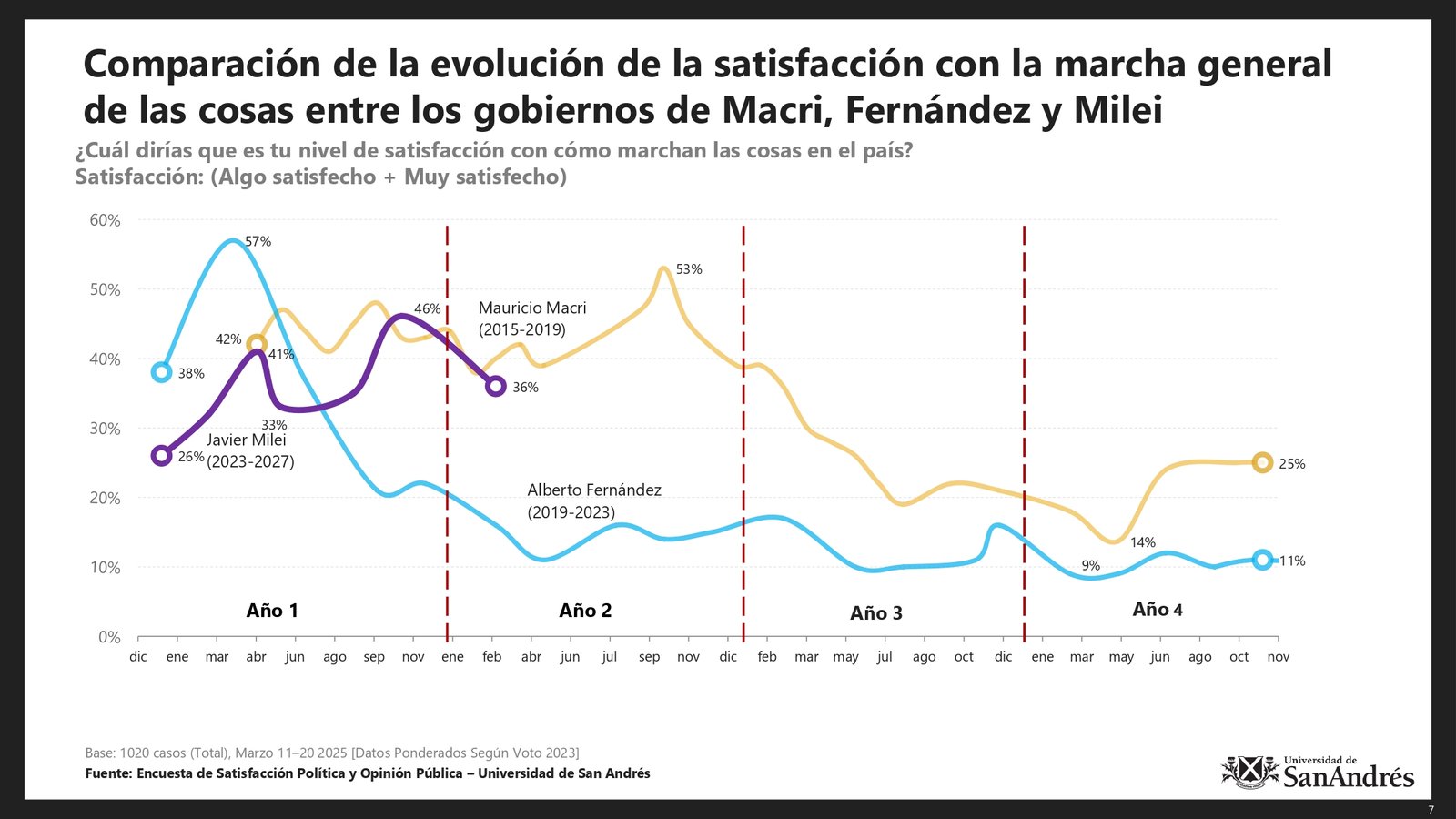 Un estudio de la Universidad de San Andrés muestra que Milei debe revertir un 61% de insatisfacción con su gobierno.
