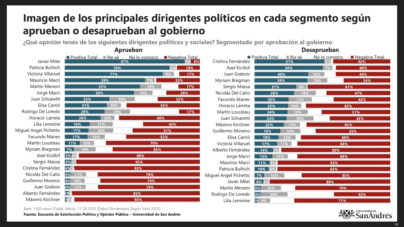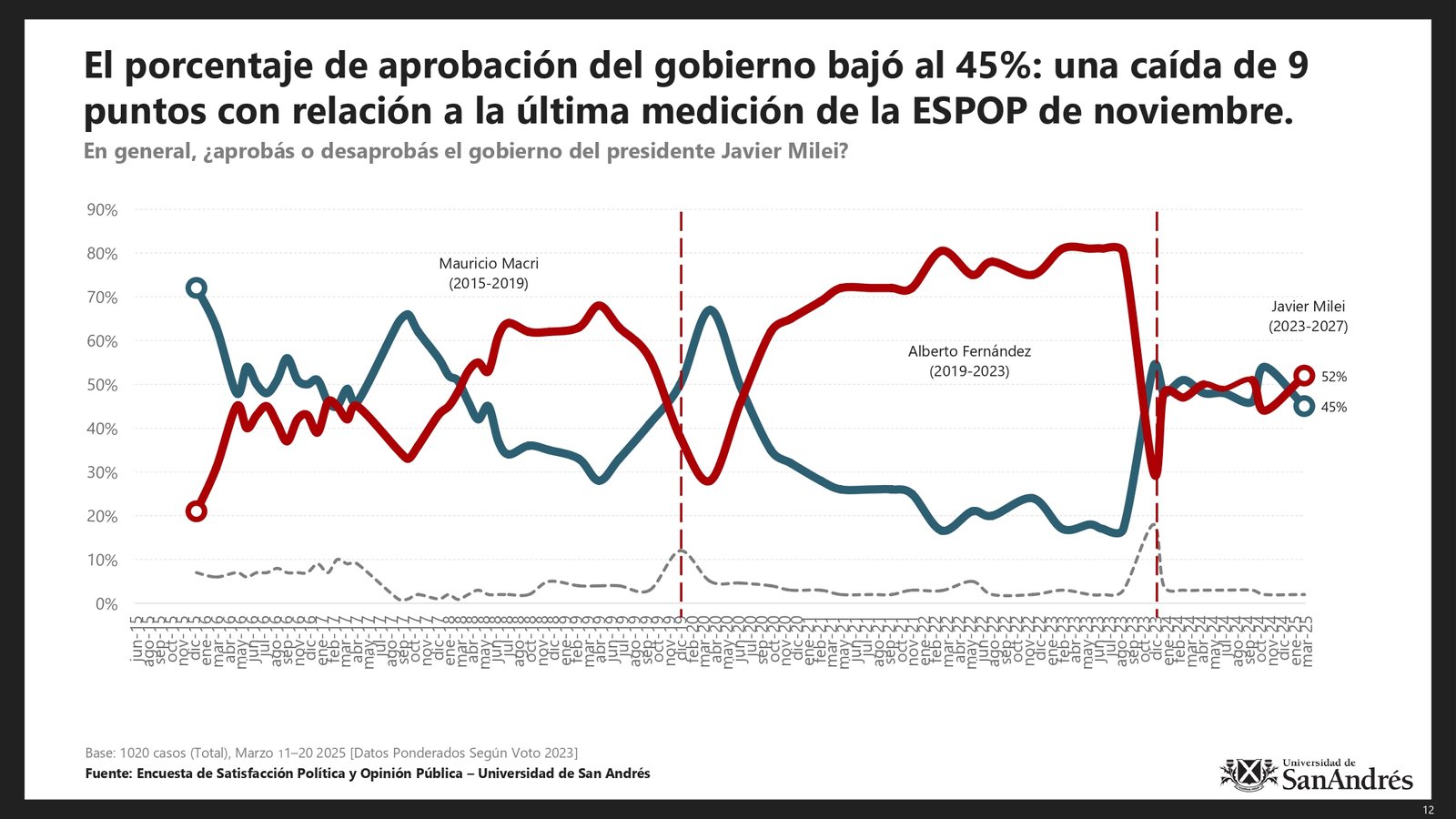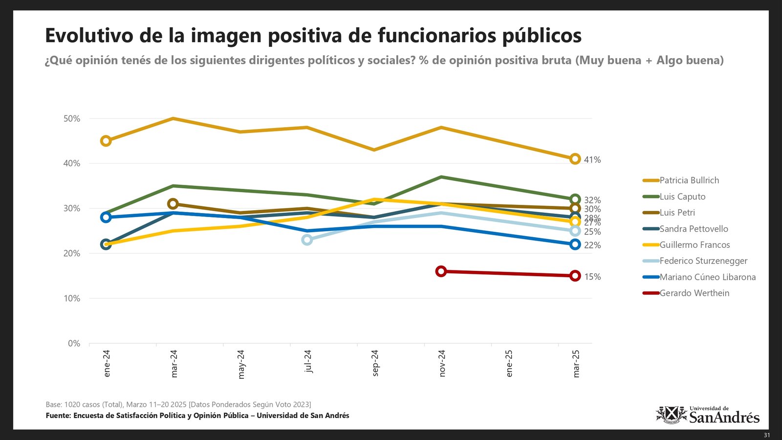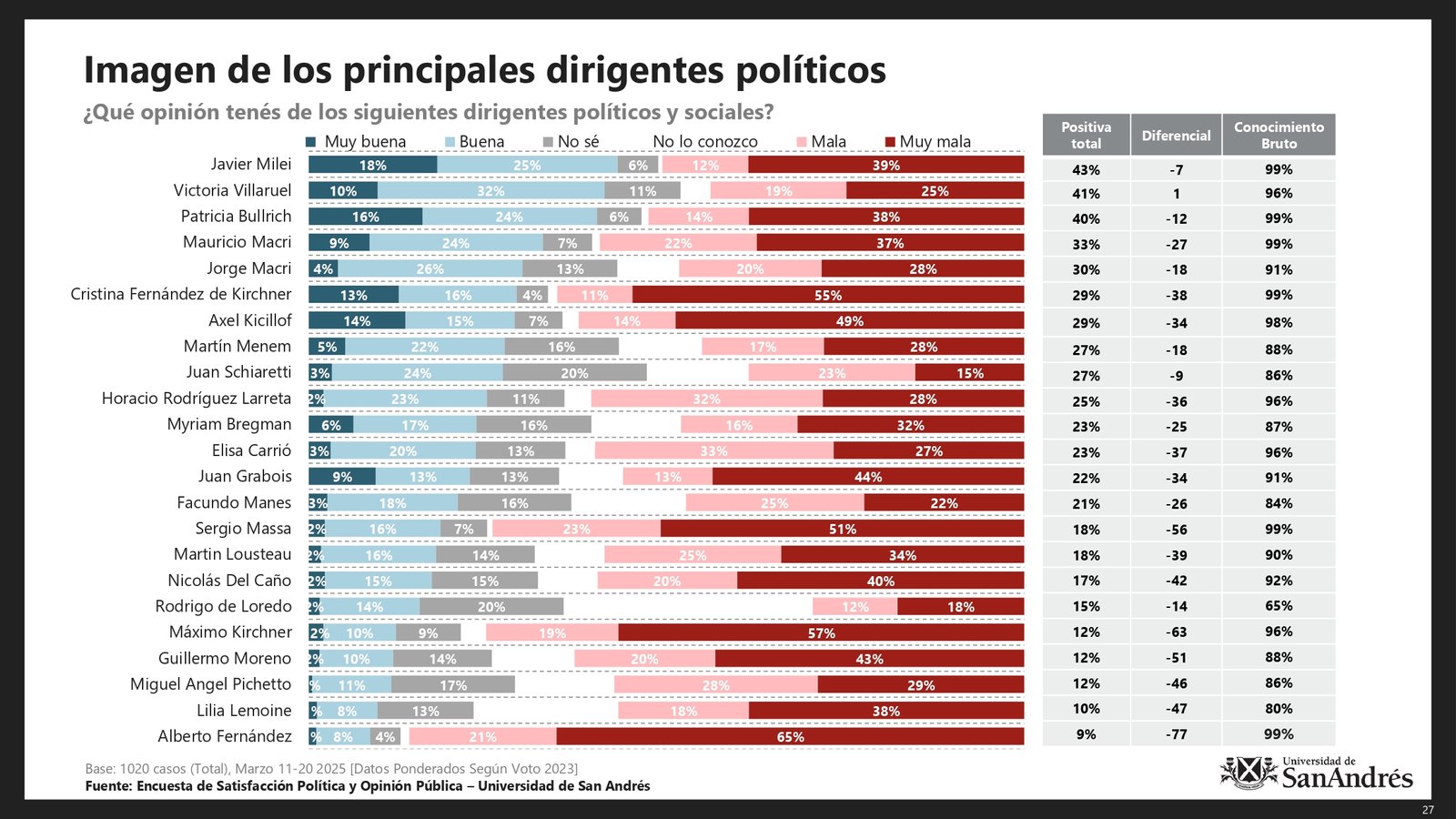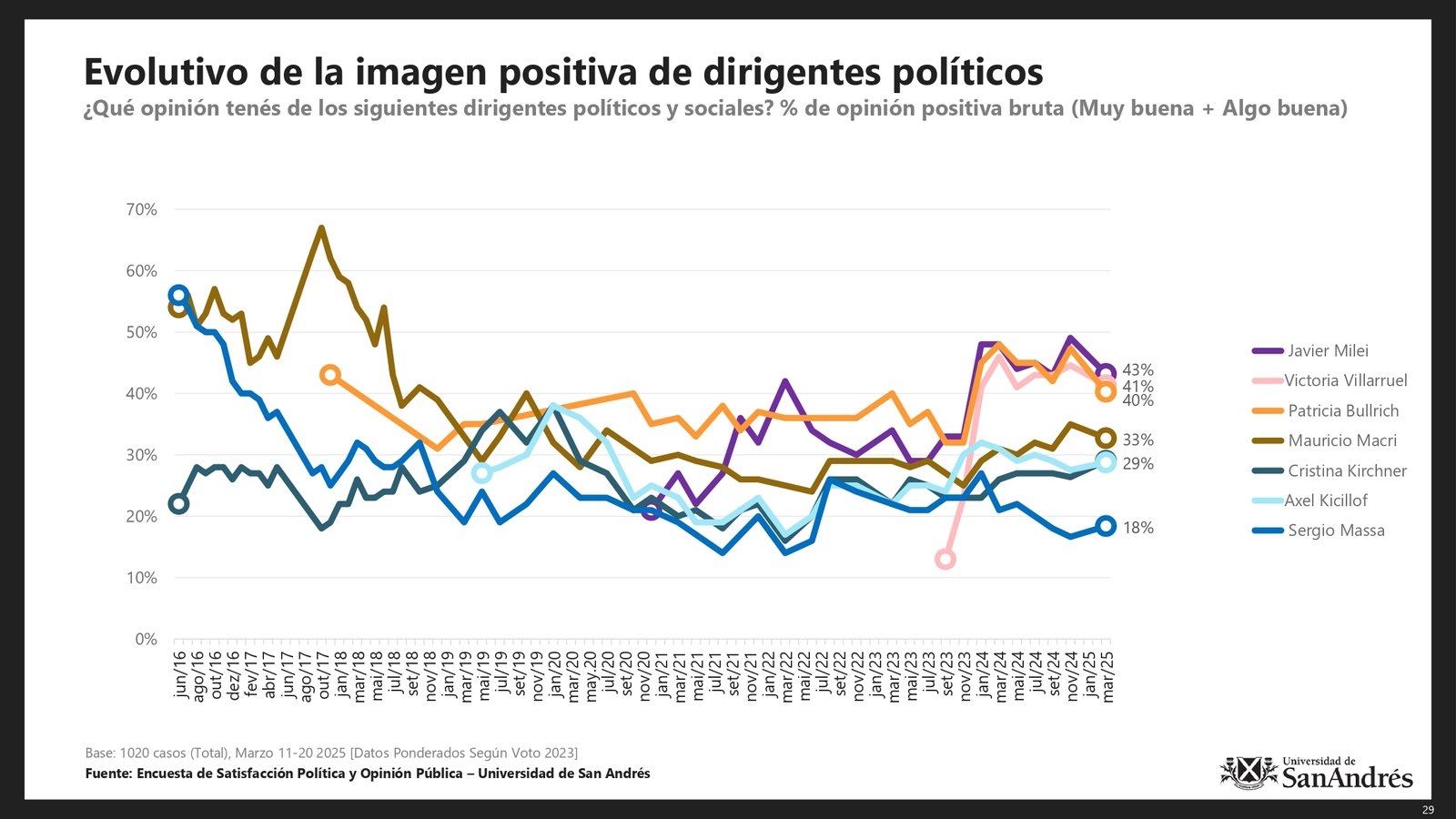 Entre noviembre del año pasado y marzo de 2025 la aprobación del gobierno bajó al 45%, lo que significa una caída de 9 puntos. La imagen de Milei tiene un diferencial negativo de 7 puntos, pero sacando a Victoria Viilaruel, el presidente es quien tiene mejores número.
