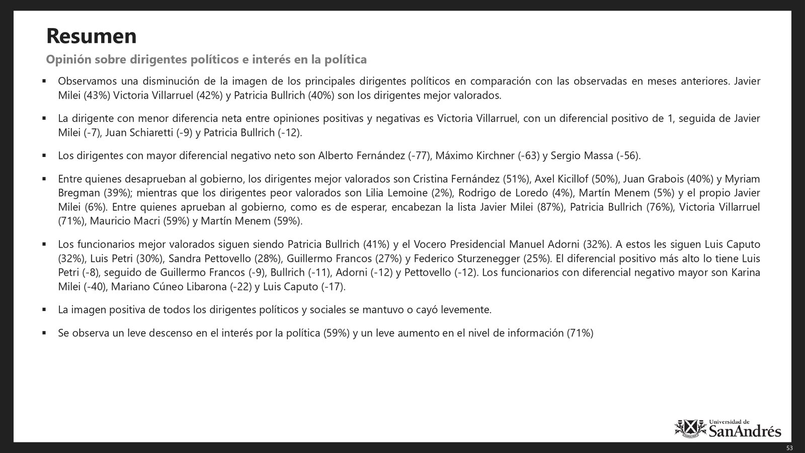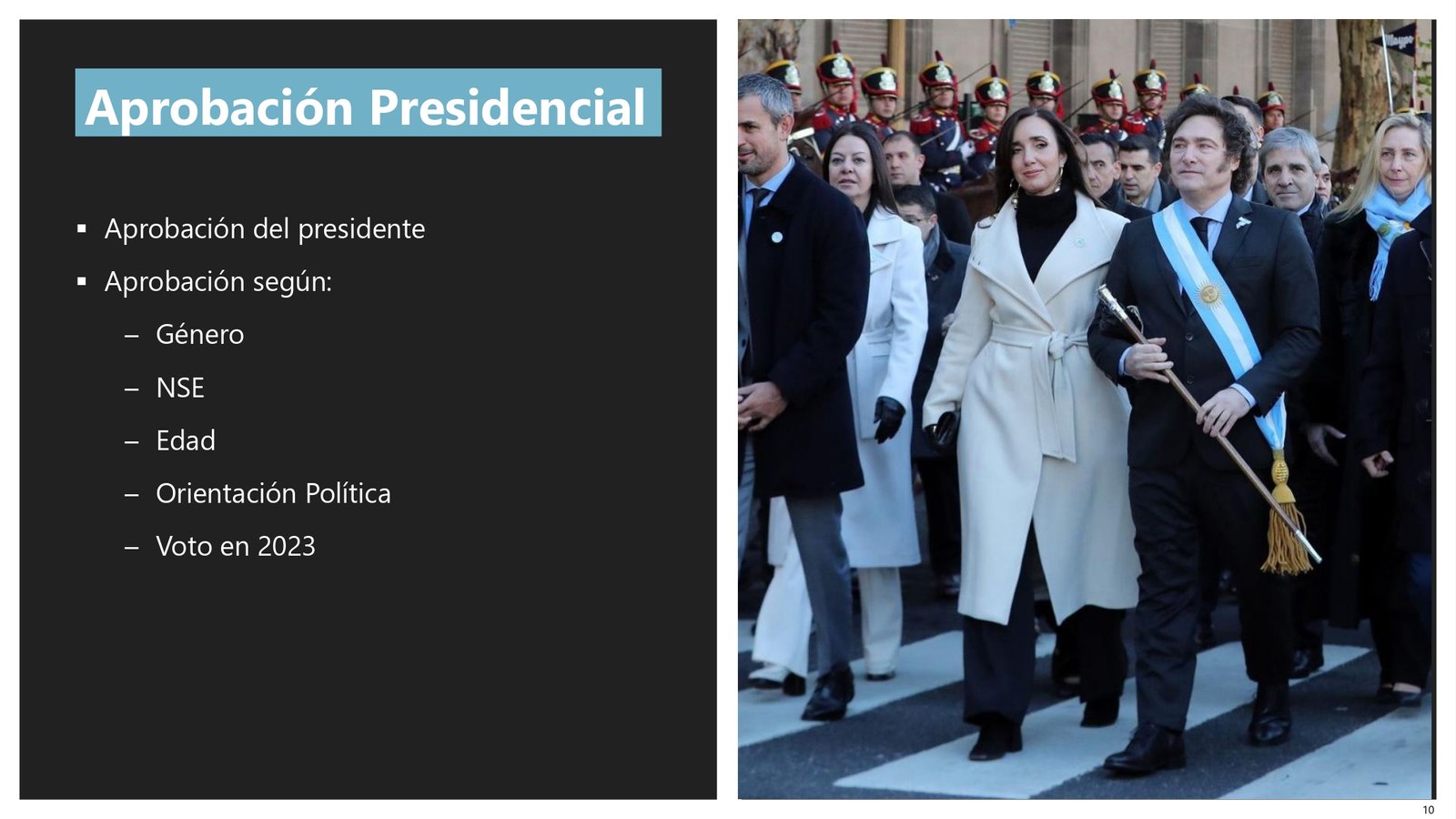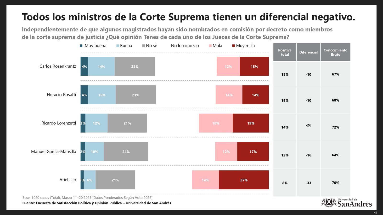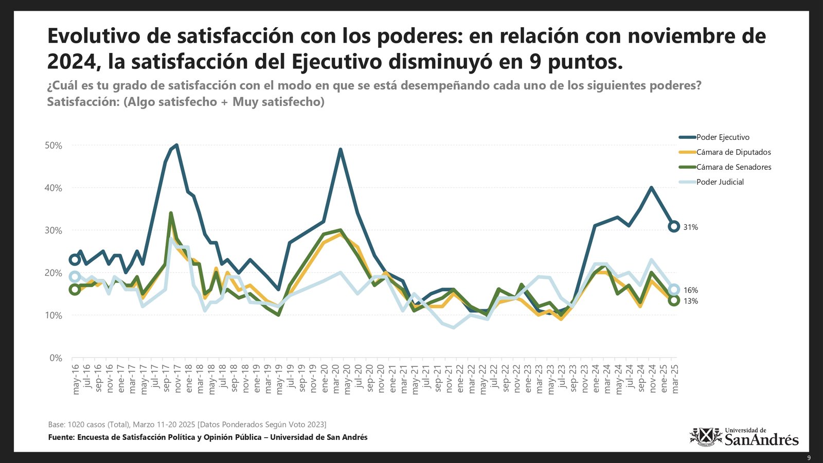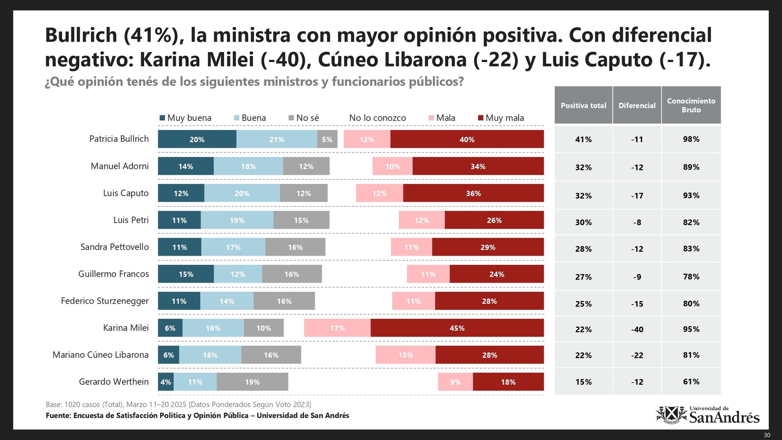 Entre noviembre del año pasado y marzo de 2025 la aprobación del gobierno bajó al 45%, lo que significa una caída de 9 puntos. La imagen de Milei tiene un diferencial negativo de 7 puntos, pero sacando a Victoria Viilaruel, el presidente es quien tiene mejores número.