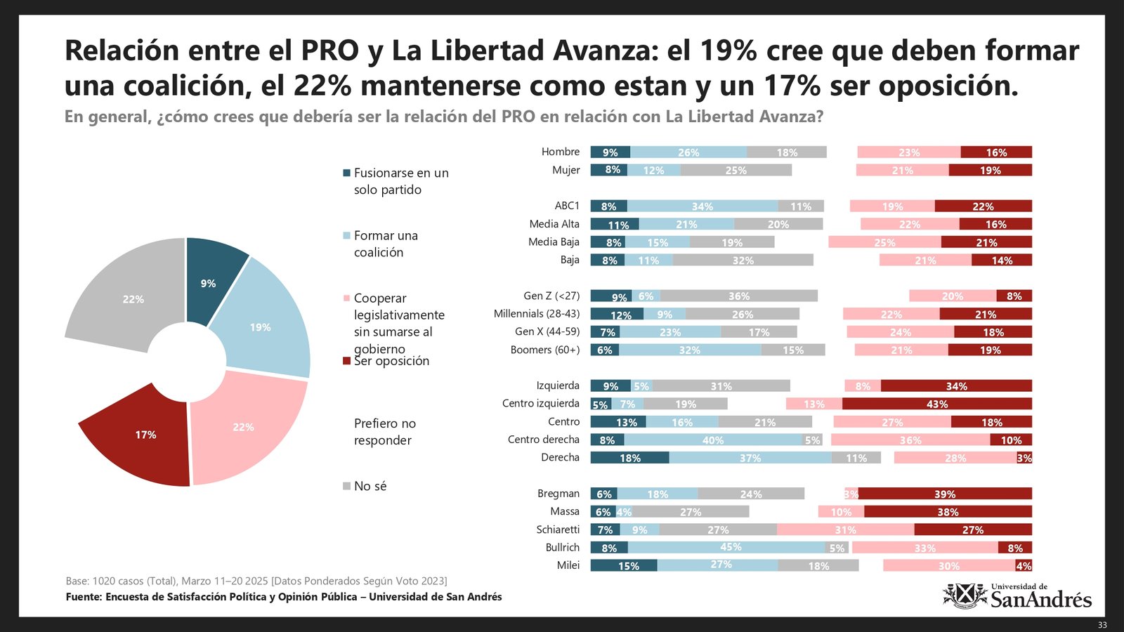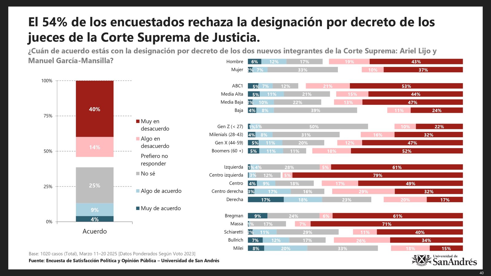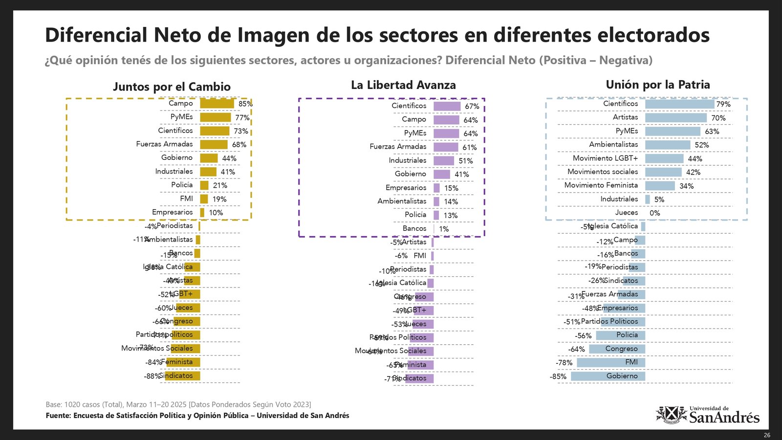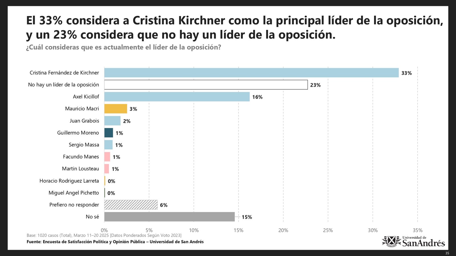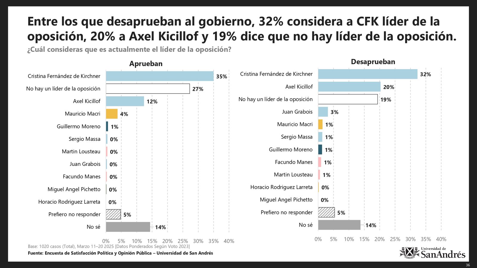 Entre noviembre del año pasado y marzo de 2025 la aprobación del gobierno bajó al 45%, lo que significa una caída de 9 puntos. La imagen de Milei tiene un diferencial negativo de 7 puntos, pero sacando a Victoria Viilaruel, el presidente es quien tiene mejores número.