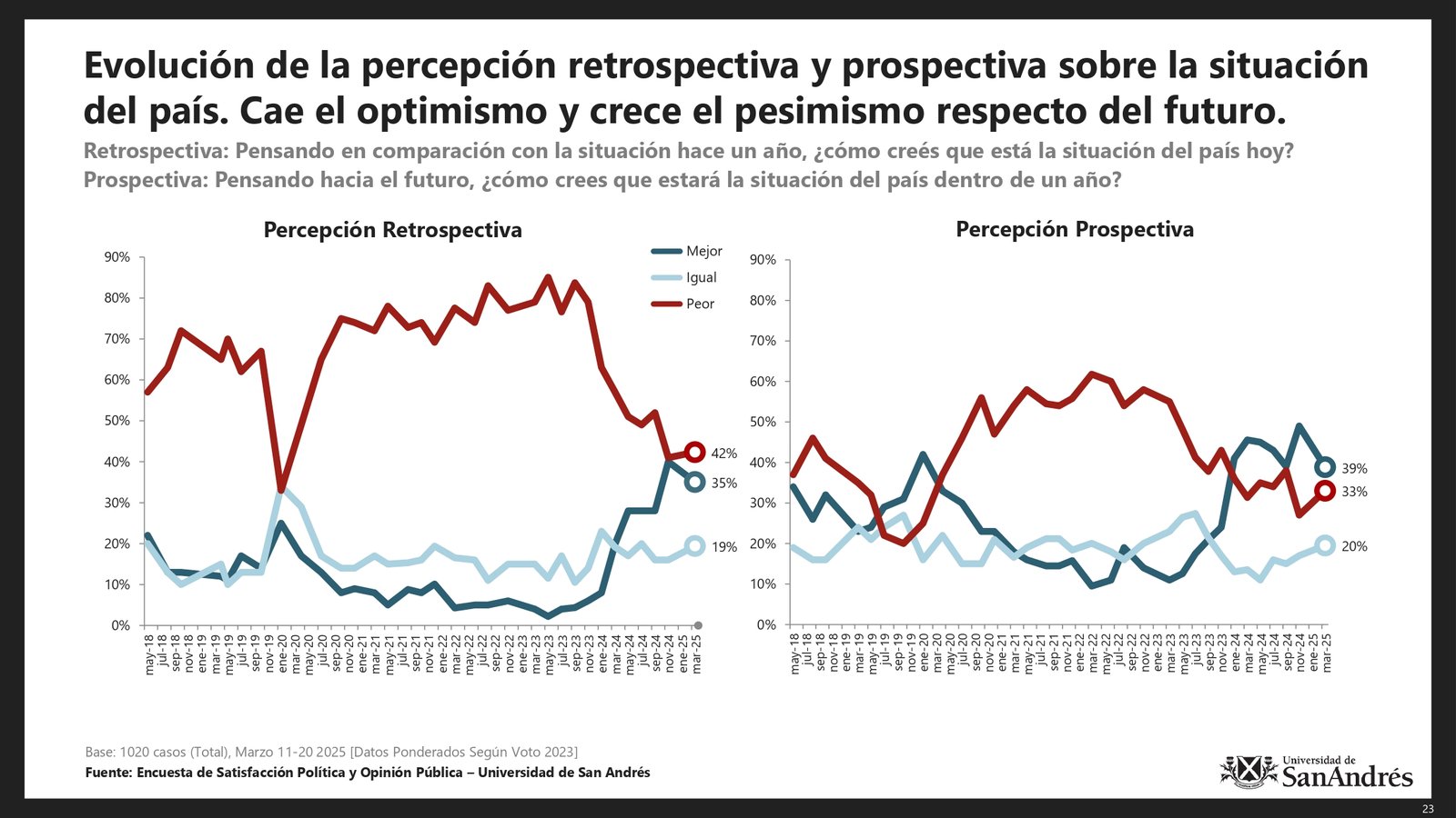 También cayeron las expectativas a futuro, aunque siguen dominando los optimistas con 39% contra 33 de los pesimistas.