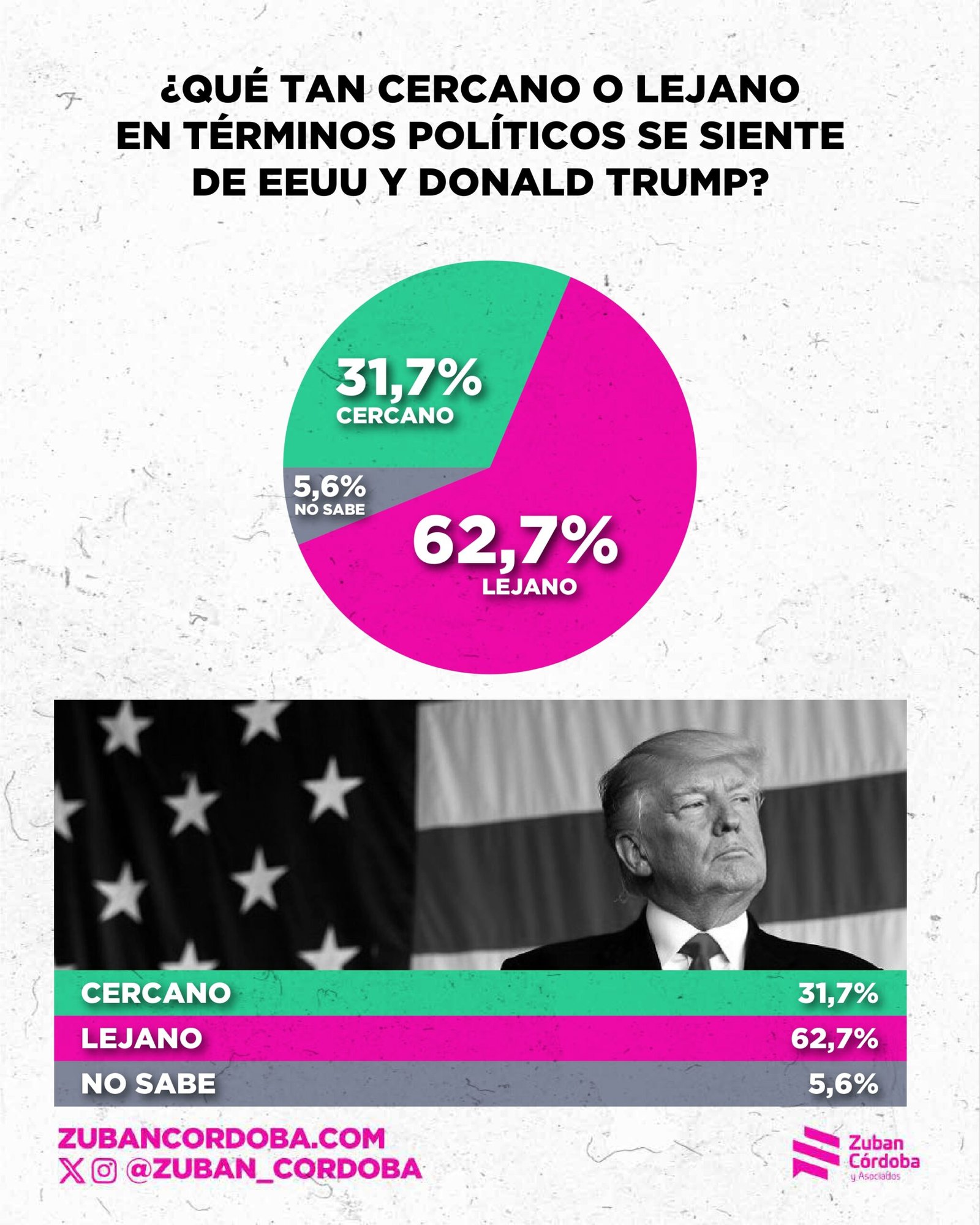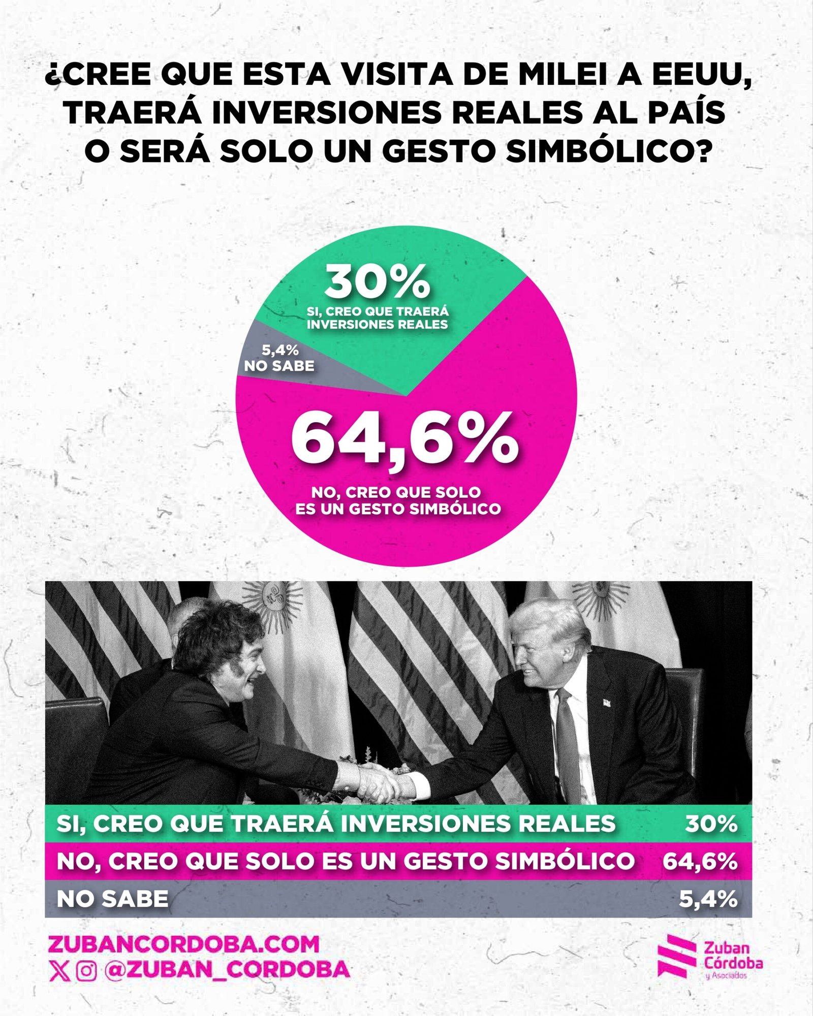 Según la encuesta de Zuban Córdoba, el el 64,6% cree que el pacto anunciado con Estados Unidos no traerá inversiones reales, sino que se trata de un gesto vacío. Además, el 62,7% de los argentinos se siente «lejano» de Trump y de Estados Unidos.