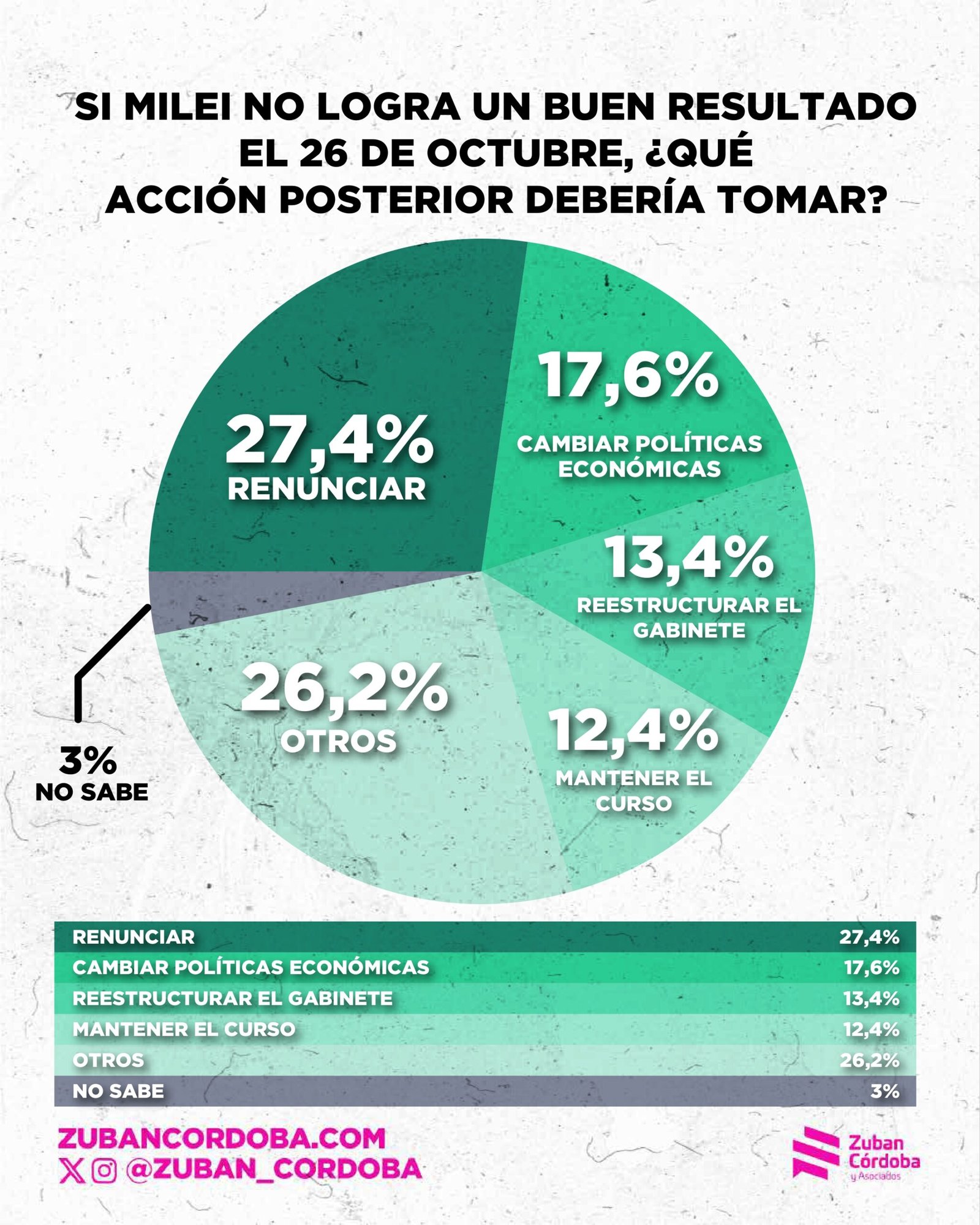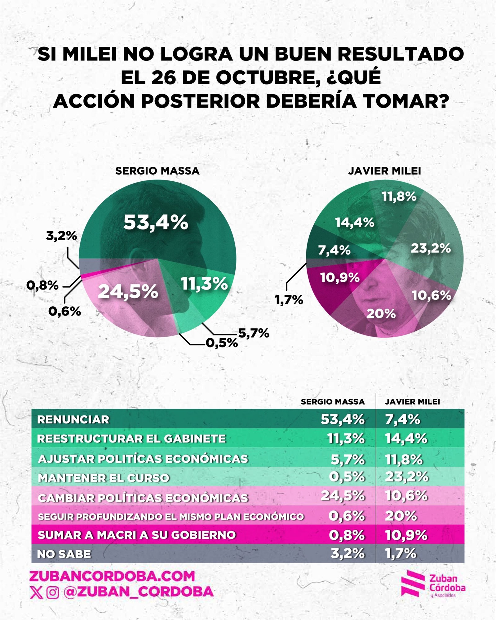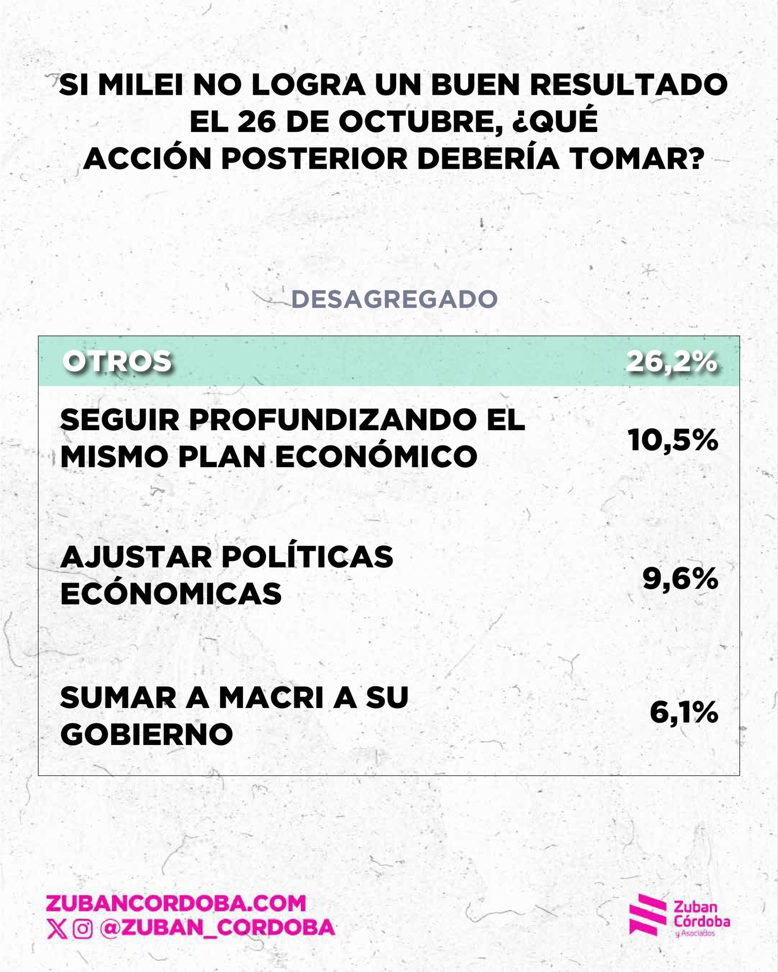La encuesta también revela la falta de entusiasmo por la vuelta a escena de Macri. Sólo un 6,1% cree que si el gobierno pierde las elecciones debería sumar al líder del PRO a su gobierno. Dos de cada tres personas creen, en ese sentido, que Macri no le va a resolver los problemas de gestión a Milei.